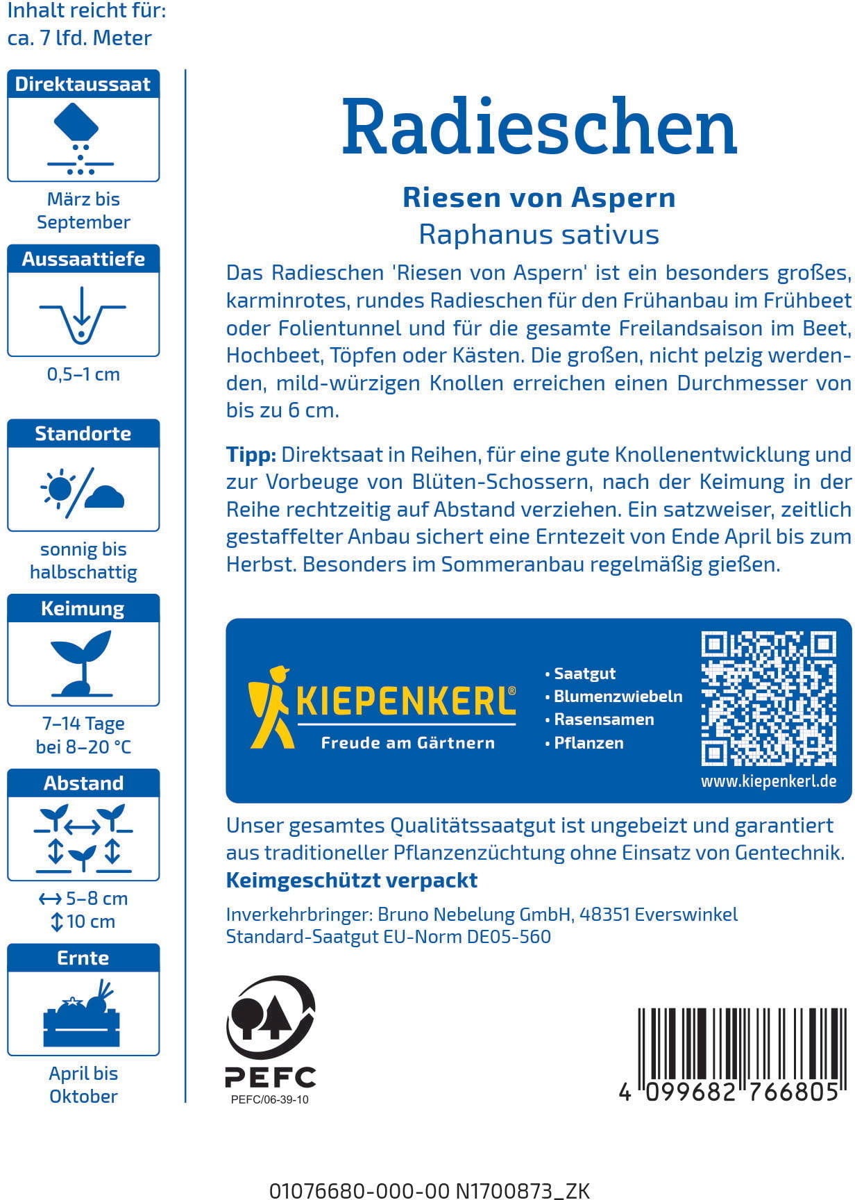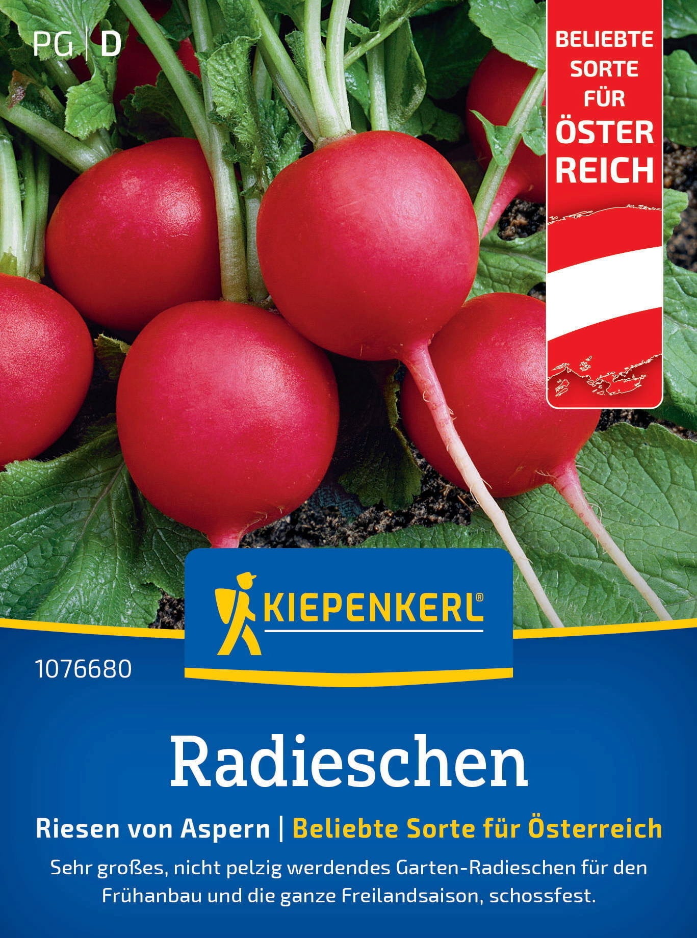 Rädisan ”Riesen von Aspern” imponerar med stora, krispiga knölar och en mild, kryddig smak. Perfekt i fräscha sallader eller som färgstarkt tillbehör - tack vare enkel odling kan du skörda färska rädisor från slutet av april och långt in på hösten i trädgården eller på balkongen.