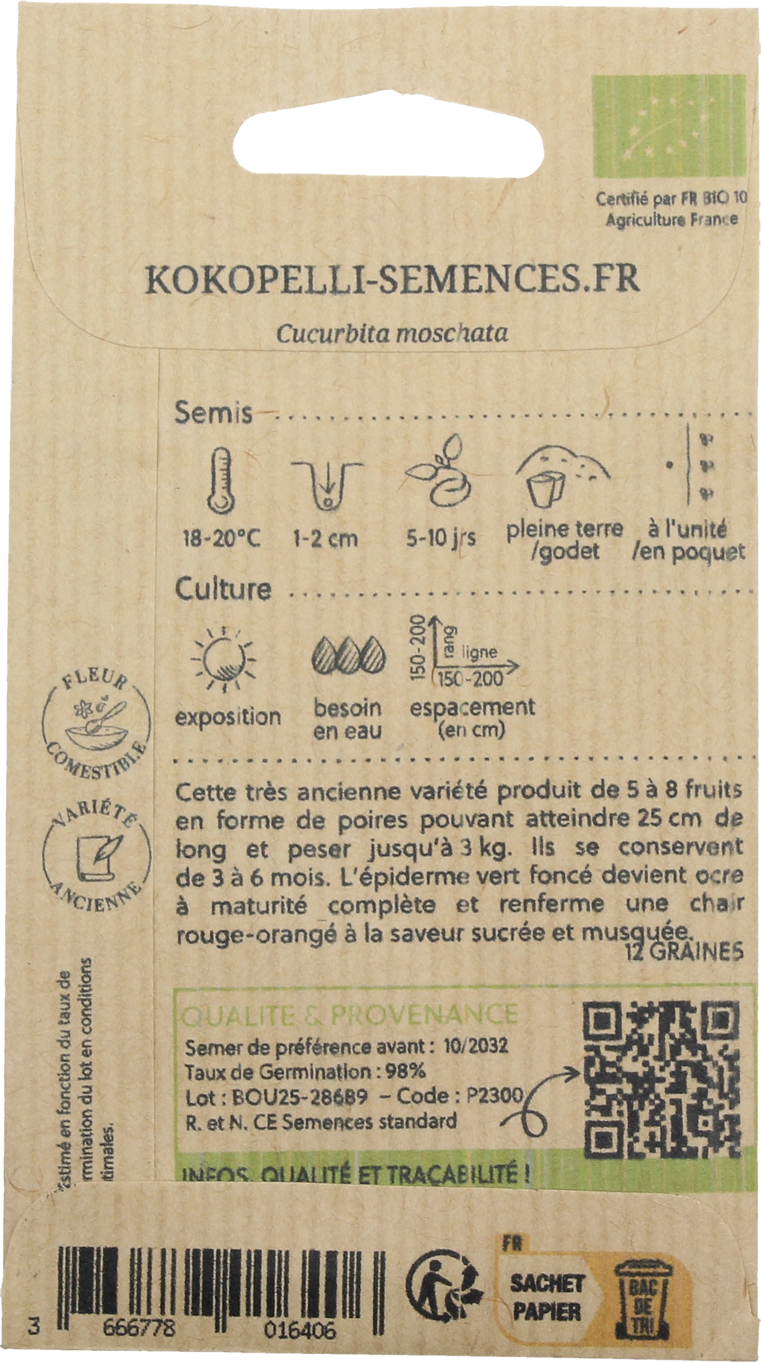 | Tillverkare: | Association Kokopelli, 7 Route de Sabarat, Foret de Castagnes, 09290, Le Mas D'Azil, Frankrike, professionnels@kokopelli-semences.fr, www.kokopelli-semences.fr |