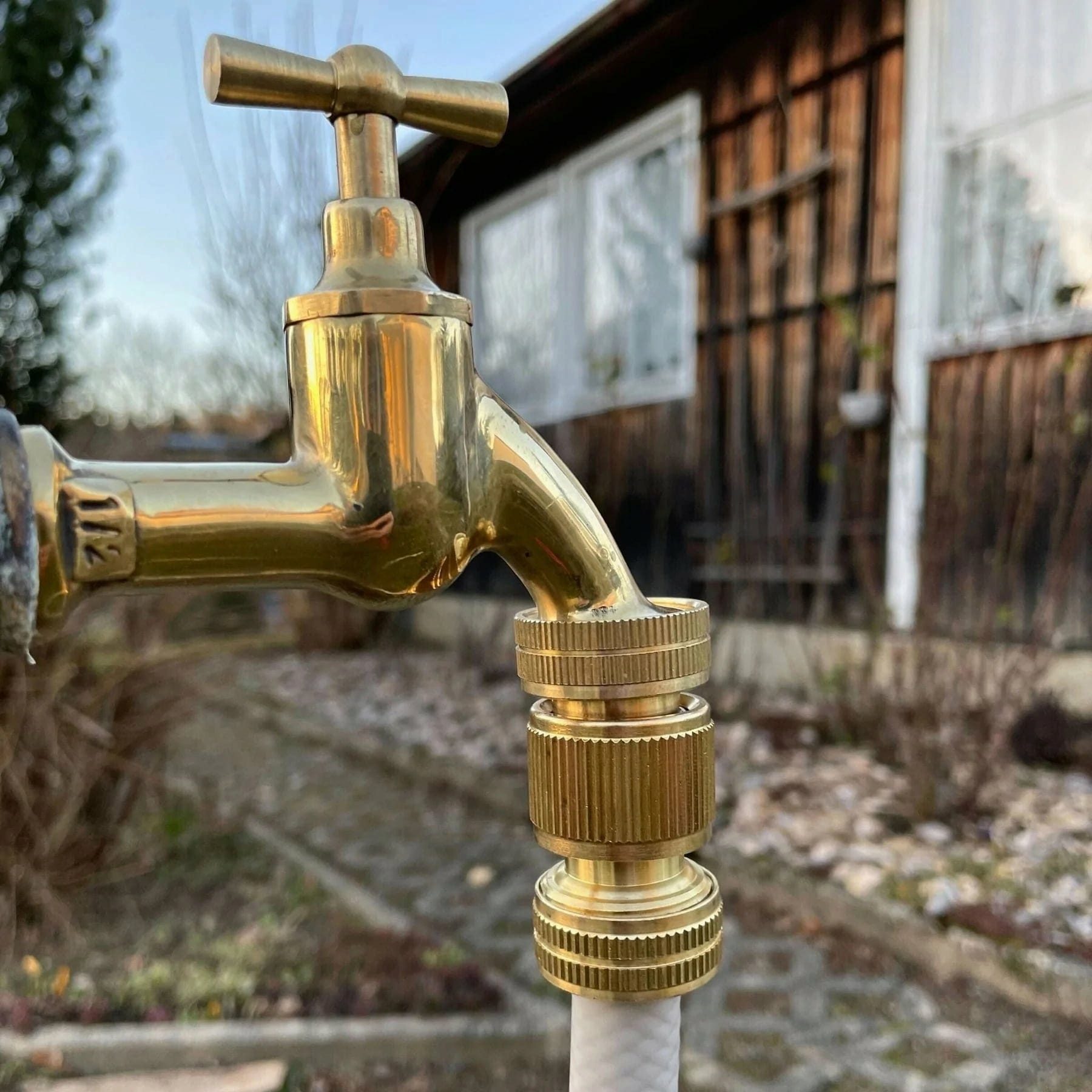 Denna vattenkran i robust mässing ger din trädgård en stilfull finish och sätter pricken över i. Med sin eleganta form och högkvalitativa utförande blir den ett blickfång som lyfter även något så vardagligt som trädgårdsbevattning - särskilt i kombination med mässingssprutan Goldie och designslangen från Livlig53.