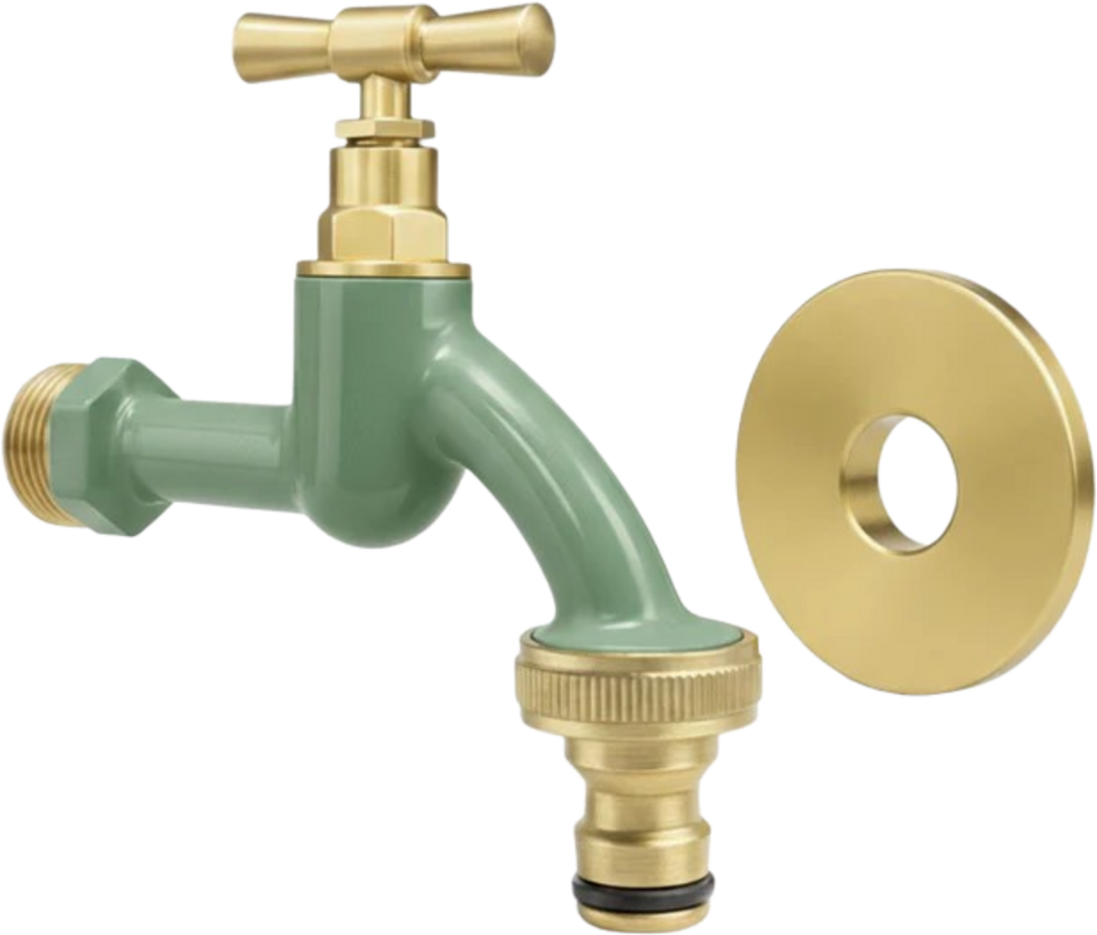 Mässingen kompletteras med en pulverlackering som inte bara ger kranen ett unikt uttryck utan också en sidenmatt yta. Den blir därmed ett stilrent inslag oavsett om den används i trädgården, på terrassen, i tvättstugan eller i garaget. Den medföljande rosettsetet ger en snygg och genomarbetad vägganslutning.