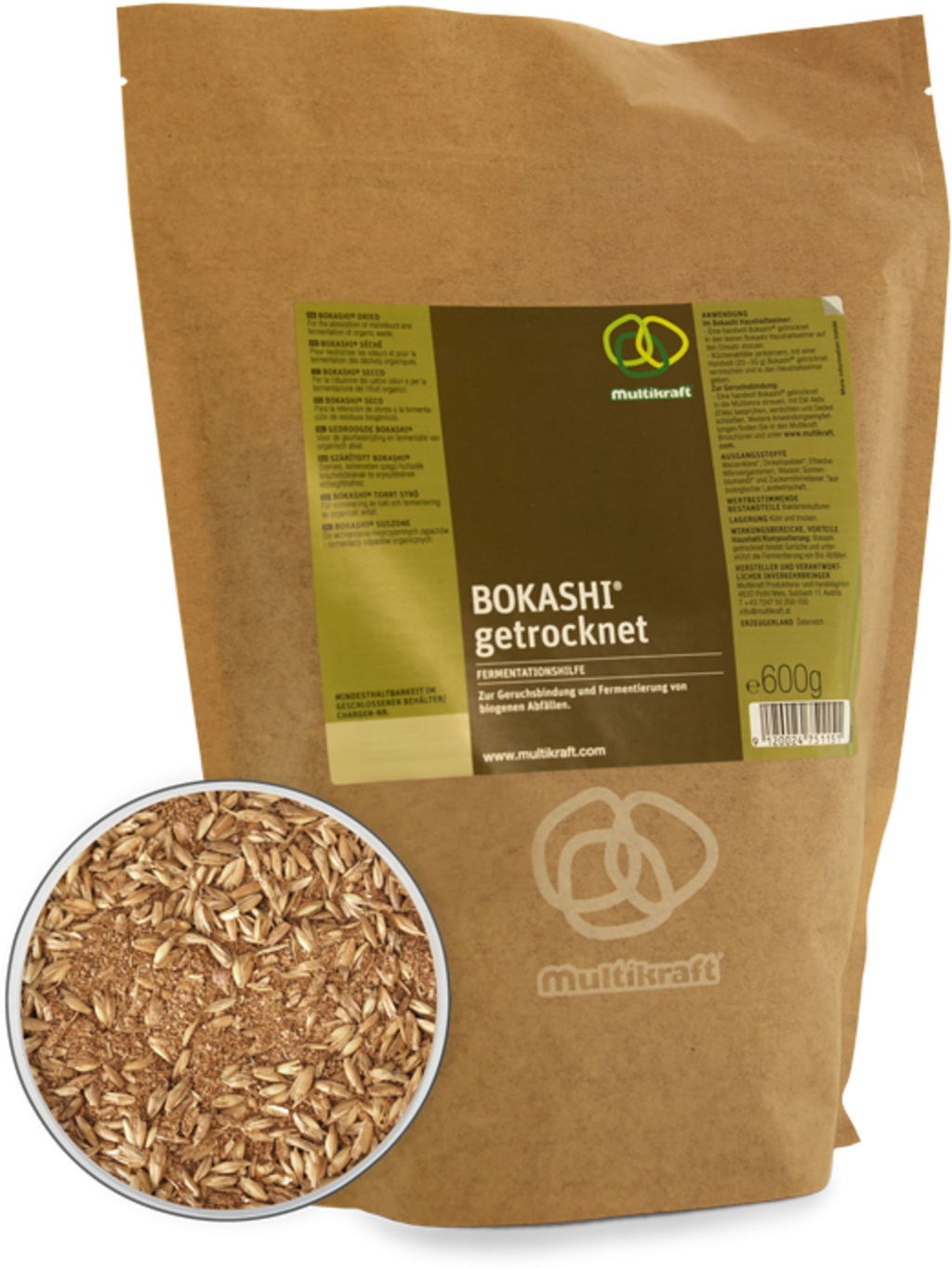 Torkad bokashi består av jäst veteklisubstrat och är idealiskt för jäsning av organiskt avfall. Den resulterande slutprodukten kan införlivas i jorden som gödningsmedel. Den resulterande vätskan har en lika utmärkt gödningseffekt och kan användas till krukväxter eller trädgårdsväxter.