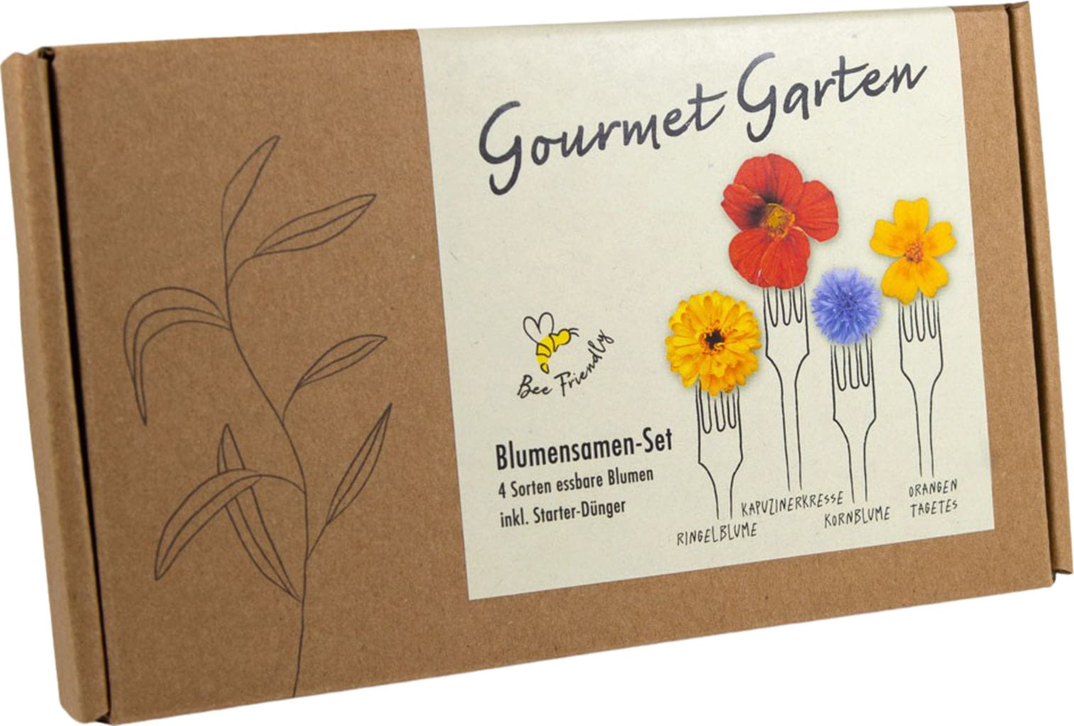 Detta vackert förpackade blomfröset innehåller frön av blåklint, ringblomma, röd krasse och orange tagetes - alla ätbara och perfekta att dekorera sallader eller soppor med. En fröjd både för ögat och för hungriga bin!