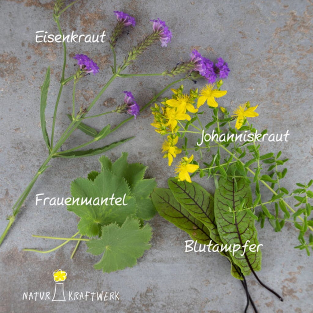 | Botaniskt namn: | Hypericum perforatum, Rumex sanguineus, Alchemilla vulgaris, Verbena officinalis |
