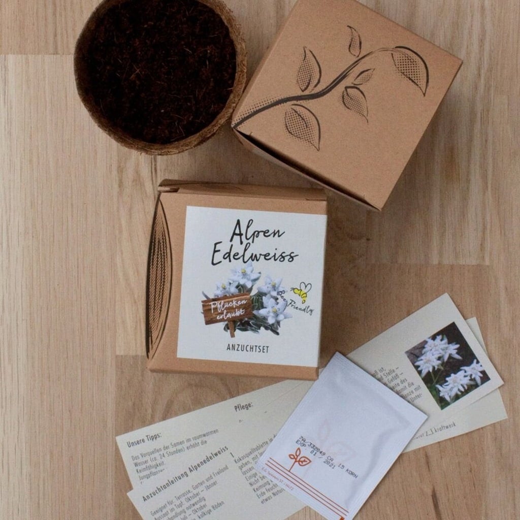 Alpene delweiß tillhör korgblommiga växter och är en av Alpernas mest ikoniska blommor. Blomningstiden sträcker sig från juli till oktober. Eftersom blomman blivit ett eftertraktat och hållbart souvenir tack vare sina många myter, är den i dag fridlyst. För edelweiss-älskare är detta odlingskit en perfekt gåva - här får du nämligen plocka helt lagligt.