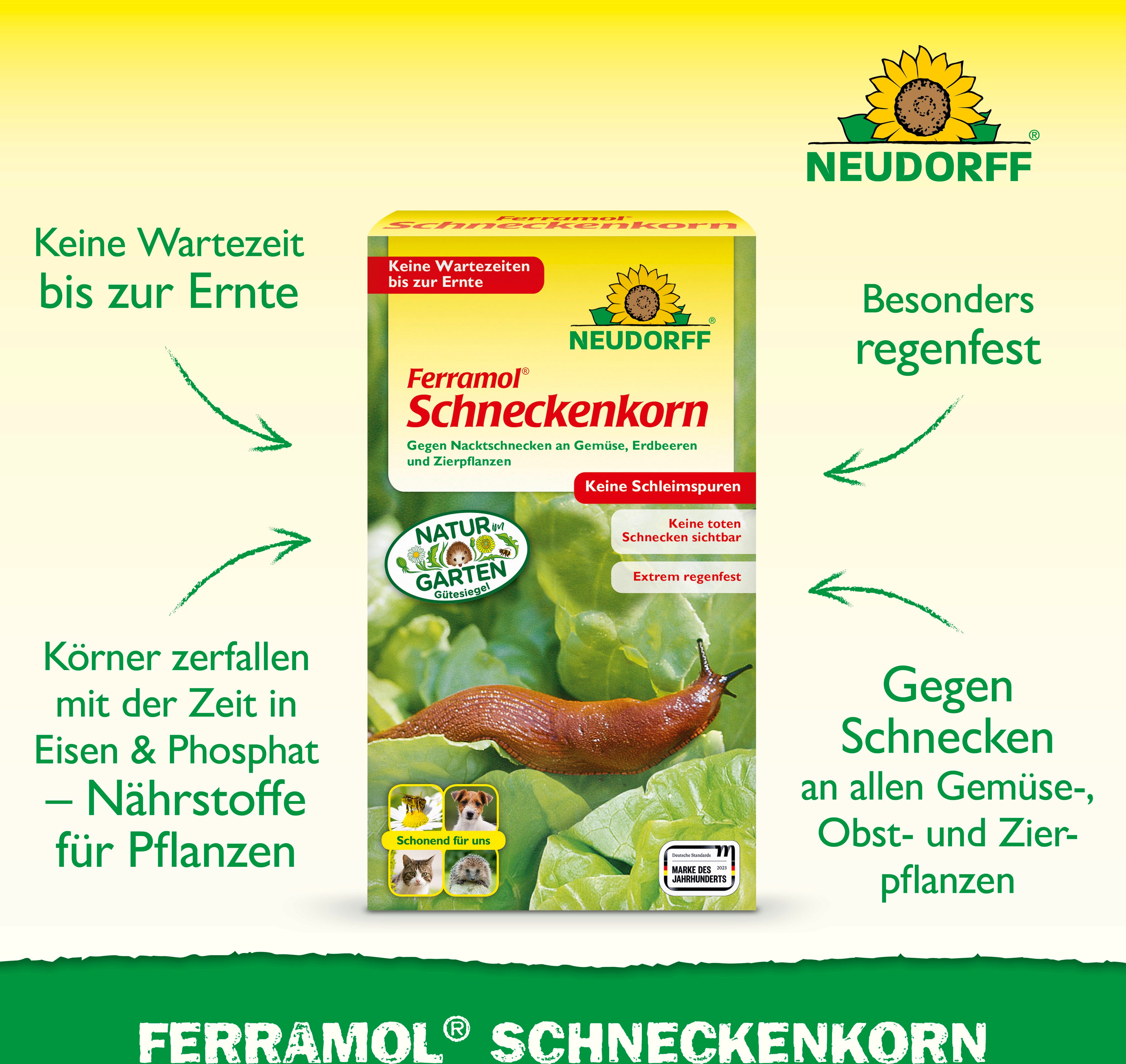 och andra nyttiga insekter. Tack vare innovativ betesteknik är det extremt regntätt. Den aktiva ingrediensen järn-III-fosfat finns också i naturen. Tack vare dess speciella verkningsmekanism syns inga snigelkadaver och det sker ingen utsöndring av sniglar.