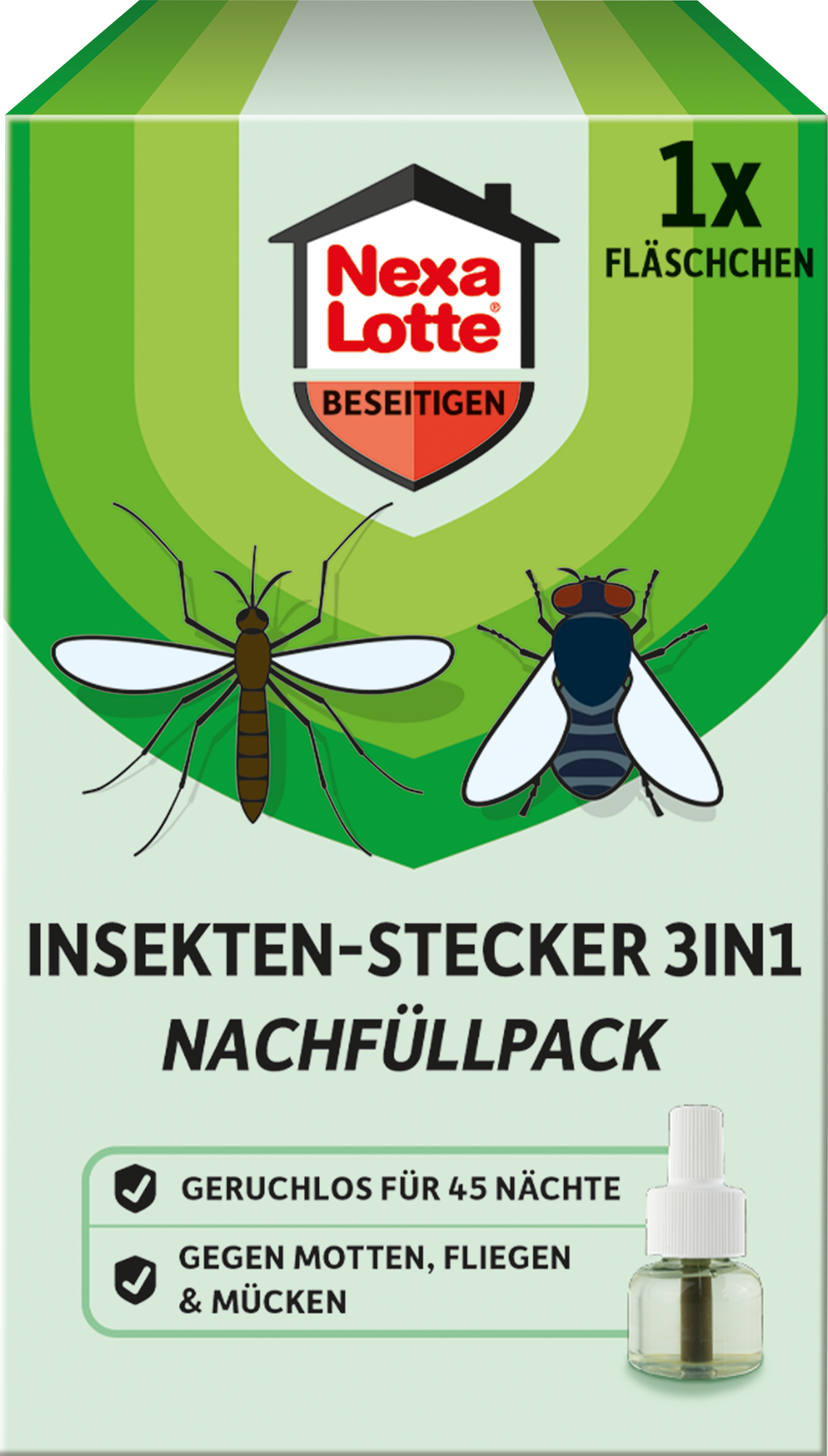 Refillflaskan till den beprövade 3-i-1-pluggen ger dig ett tillförlitligt skydd mot myggor, flugor och malar - utan obehaglig lukt. Sätt bara i flaskan, anslut och den aktiva ingrediensen fördelas jämnt i hela rummet. Så att du kan sova gott utan att väckas av surrande skadedjur. Perfekt för alla bostadsutrymmen och även perfekt för resor i husbil eller fritidshus.