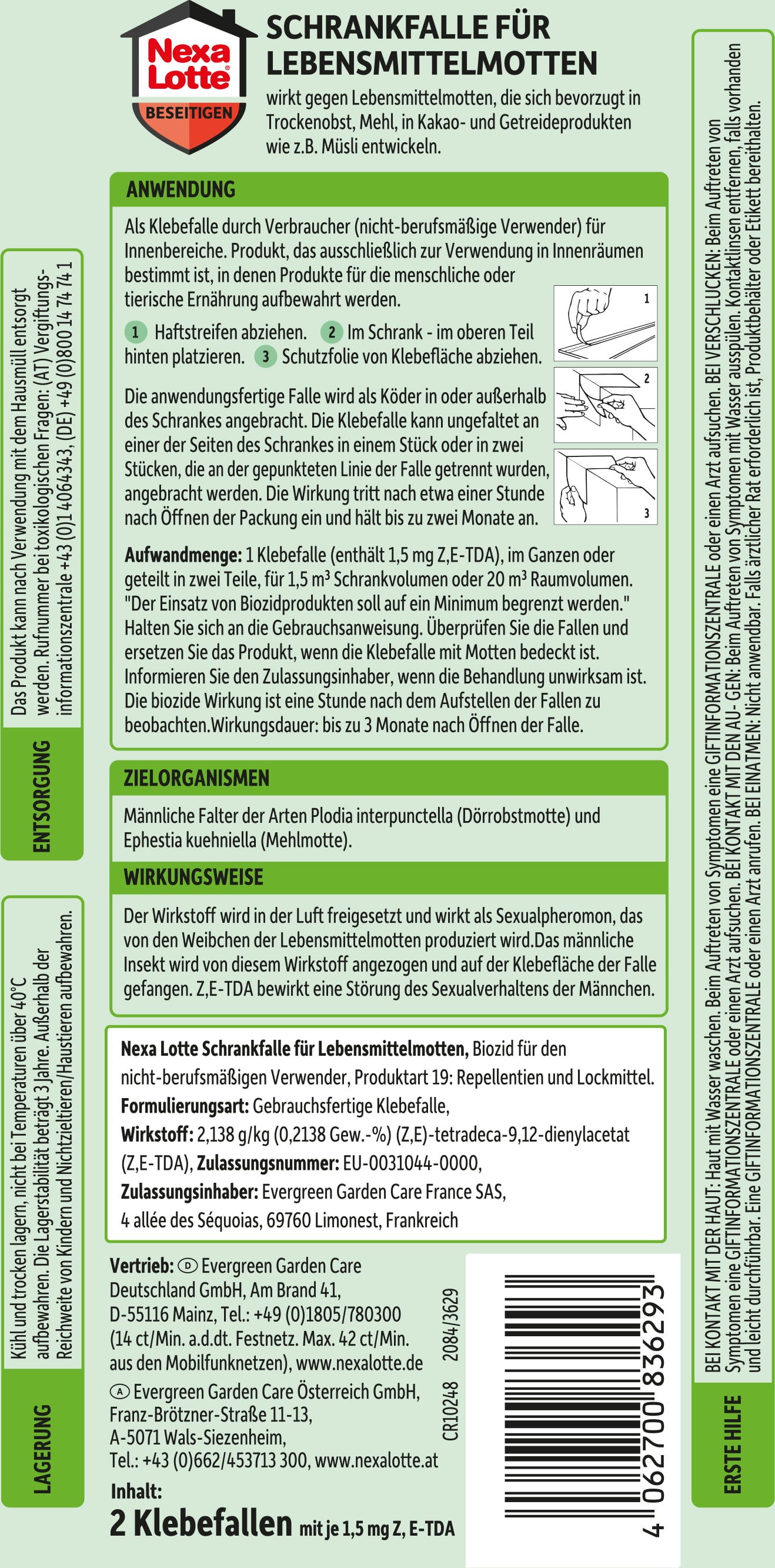 Denna luktfria klibbiga fälla utvecklades specifikt för att bekämpa skafferimalar som torkad frukt, mjöl, dadlar och skafferimalar, vilka ofta förökar sig i torra livsmedel som mjöl, flingor, kakao, nötter eller djurfoder. Ett artspecifikt könsattraktionsmedel (feromon) som finns i limmet attraherar specifikt hanmalarna. De fäster på limytan, vilket förhindrar reproduktion och effektivt minskar angrepp.