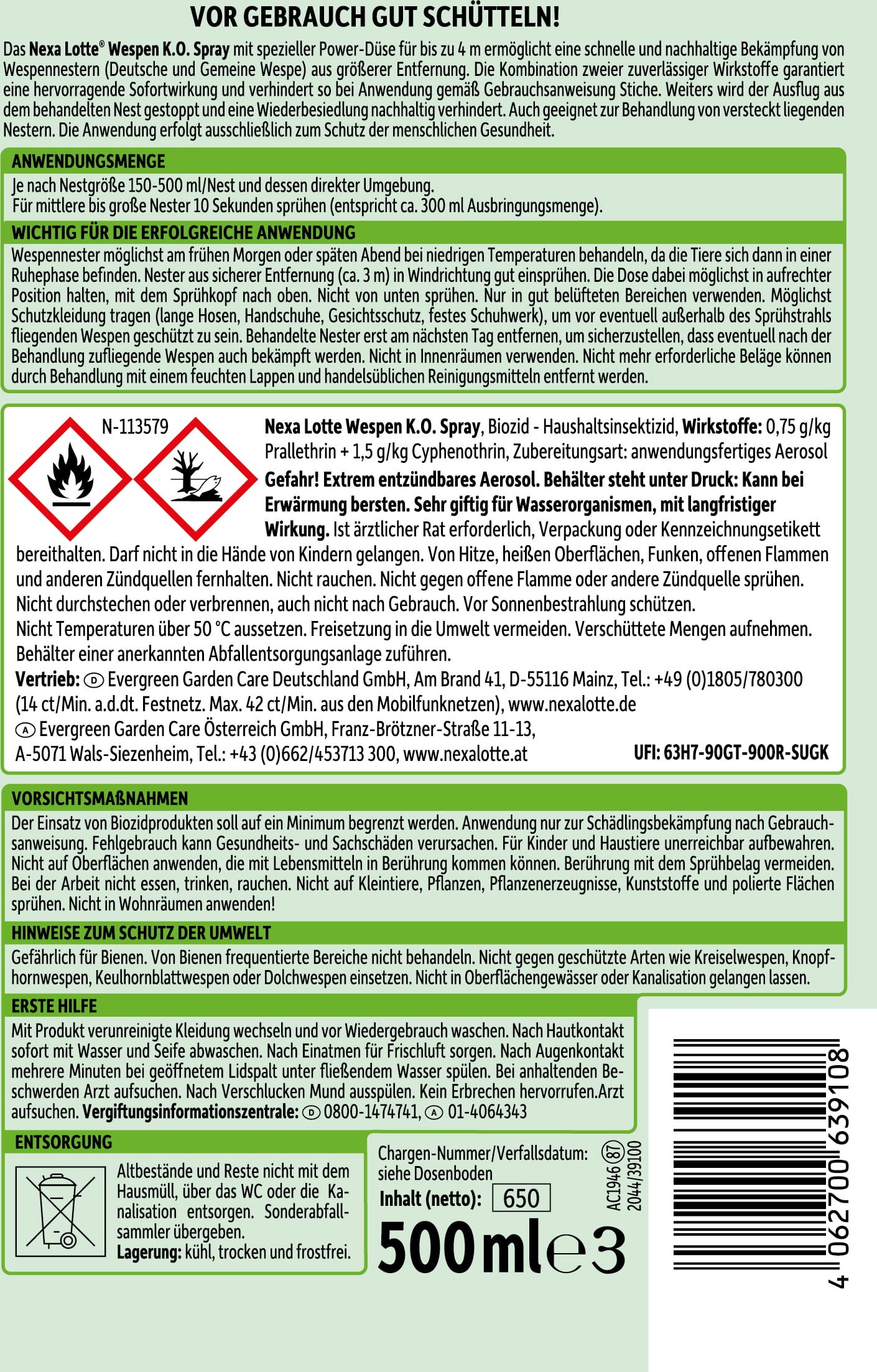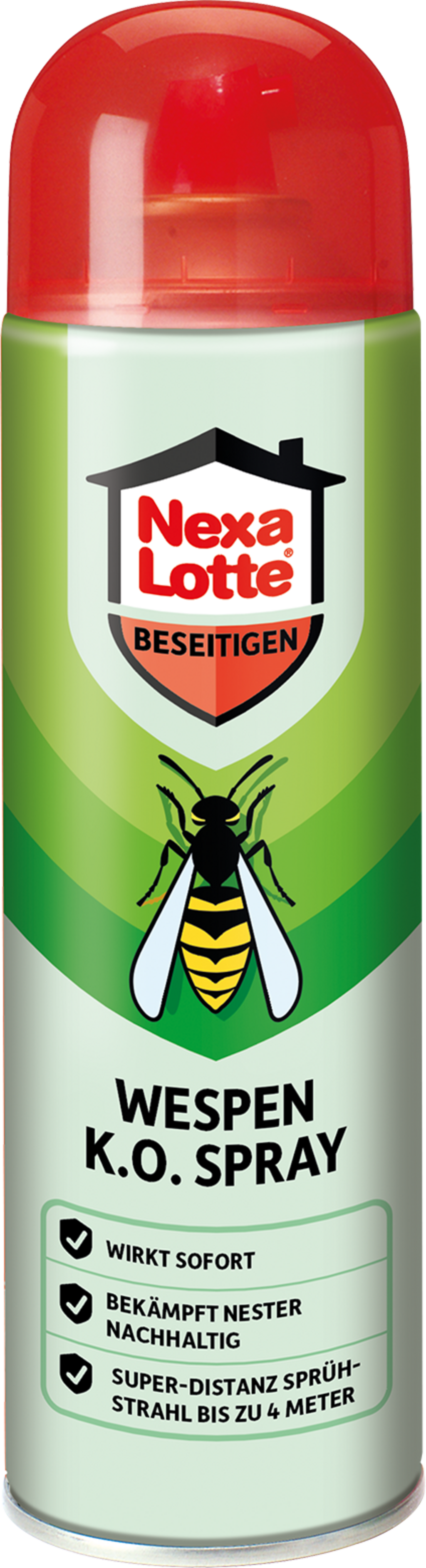 Nexa Lotte Wasp K.O. Spray är en mycket effektiv och säker lösning för bekämpning av getingbon - även från ett säkert avstånd. Med det praktiska munstycket kan du nå boet från upp till 4 meters avstånd utan att utsätta dig för fara. Två kraftfulla aktiva ingredienser säkerställer en snabb bekämpningseffekt och förhindrar att boet dyker upp igen eller koloniseras på nytt.