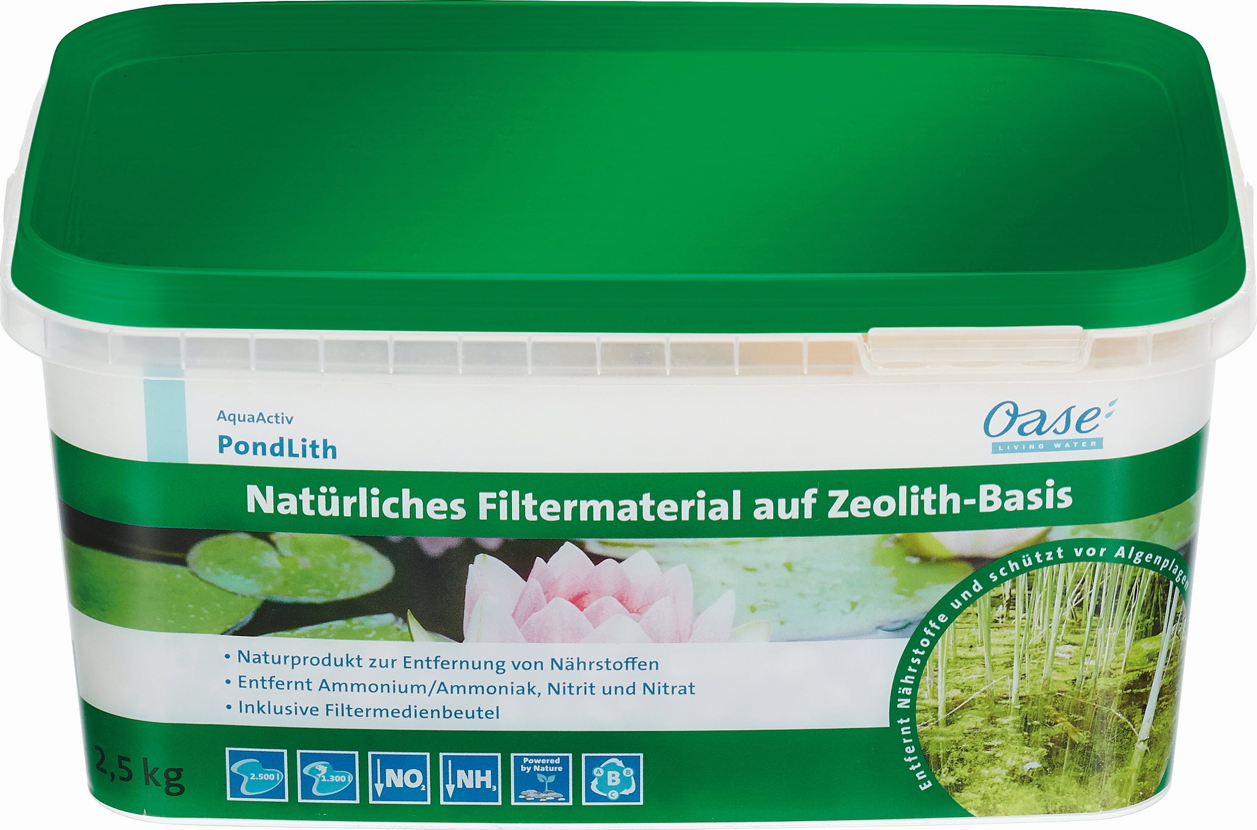 Oase AquaActiv PondLith är ett filtermaterial baserat på rent naturlig zeolit med en kornstorlek på 5-10 mm. Den är särskilt kraftfull när det gäller att bryta ner kväveföreningar. Det är också ett snabbt botemedel mot överskott av ammonium.