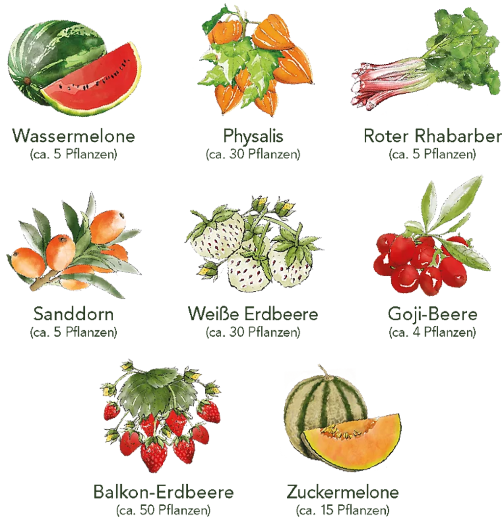 balkongjordgubbe, vit jordgubbe, physalis, rabarber, havtorn, vattenmelon, sockermelon, gojibär