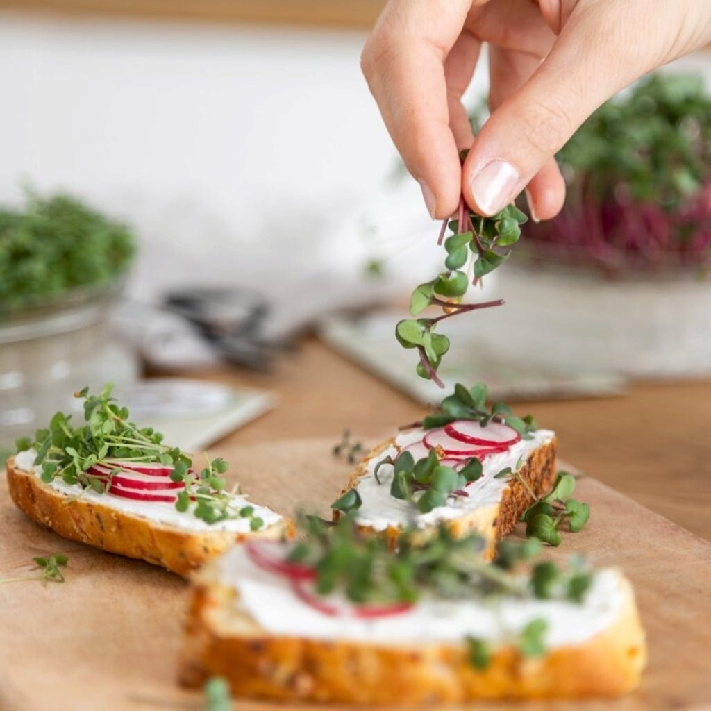 Trädgårdskrasse, Alfalfa, Vit senap, Daikonrädisor, Rucola, Brokkoletti (ursprunglig broccoli), Japansk senapskål (Mizuna Red), Rädisa (China Rose)