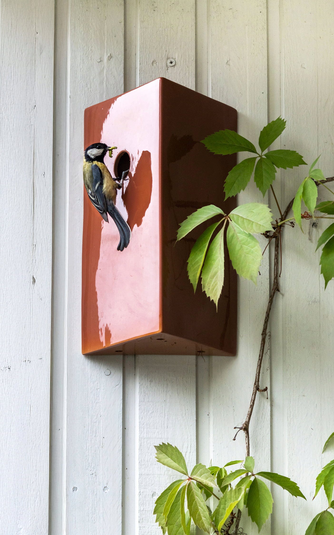 Fågelholken är handgjord i Portugal och är tillverkad av giftfritt, värmebehandlat tallträ och glaserad keramik. Strukturen är uppruggad på insidan under utgångsöppningen för att göra det lättare för fåglarna att klättra ut.
