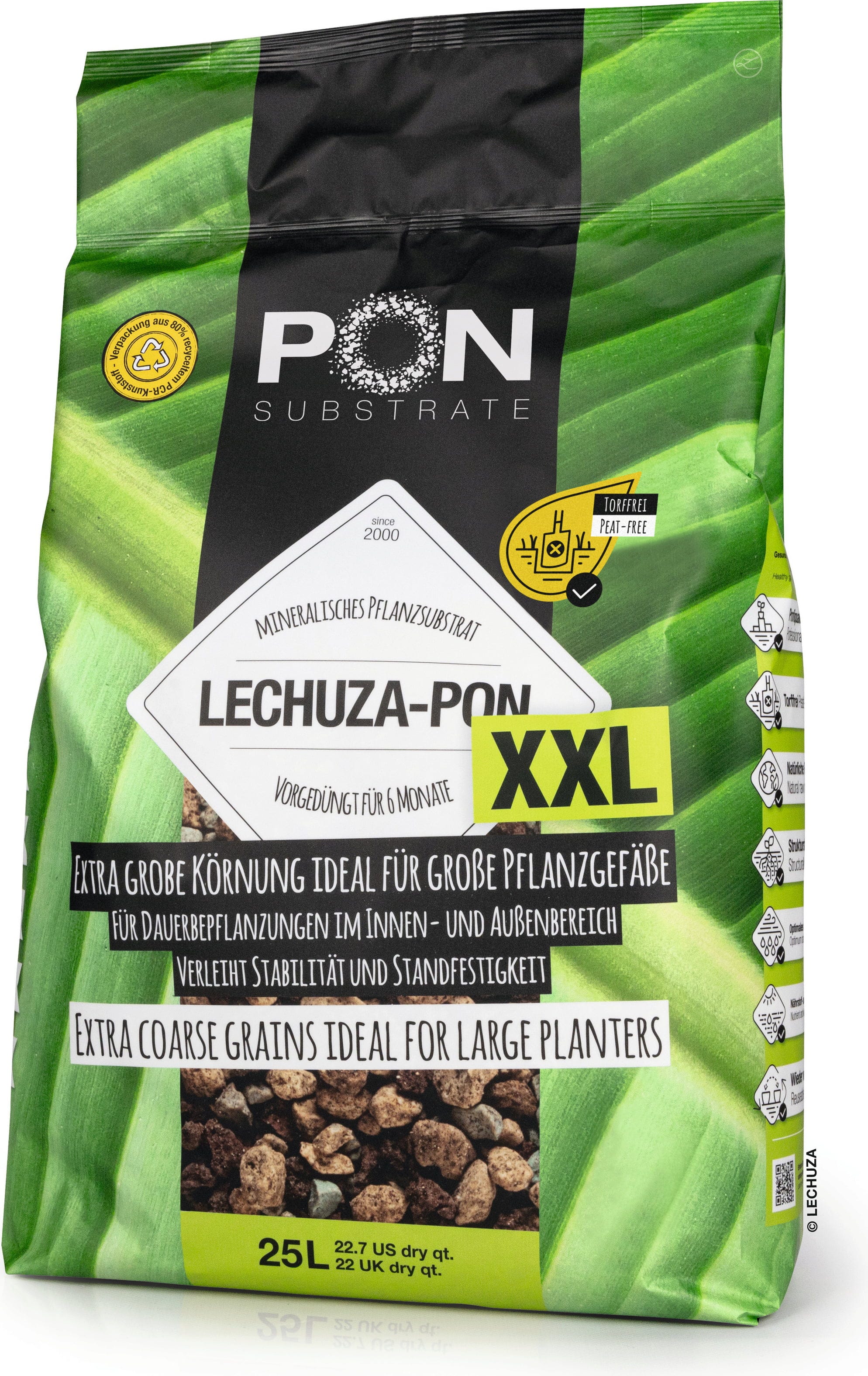Tack vare den extra grova strukturen ger Lechuzapon XXL maximal stabilitet för tunga växter och buskar. Det karaktäristiska utseendet gör det dessutom särskilt exklusivt som dekorativt topplager.