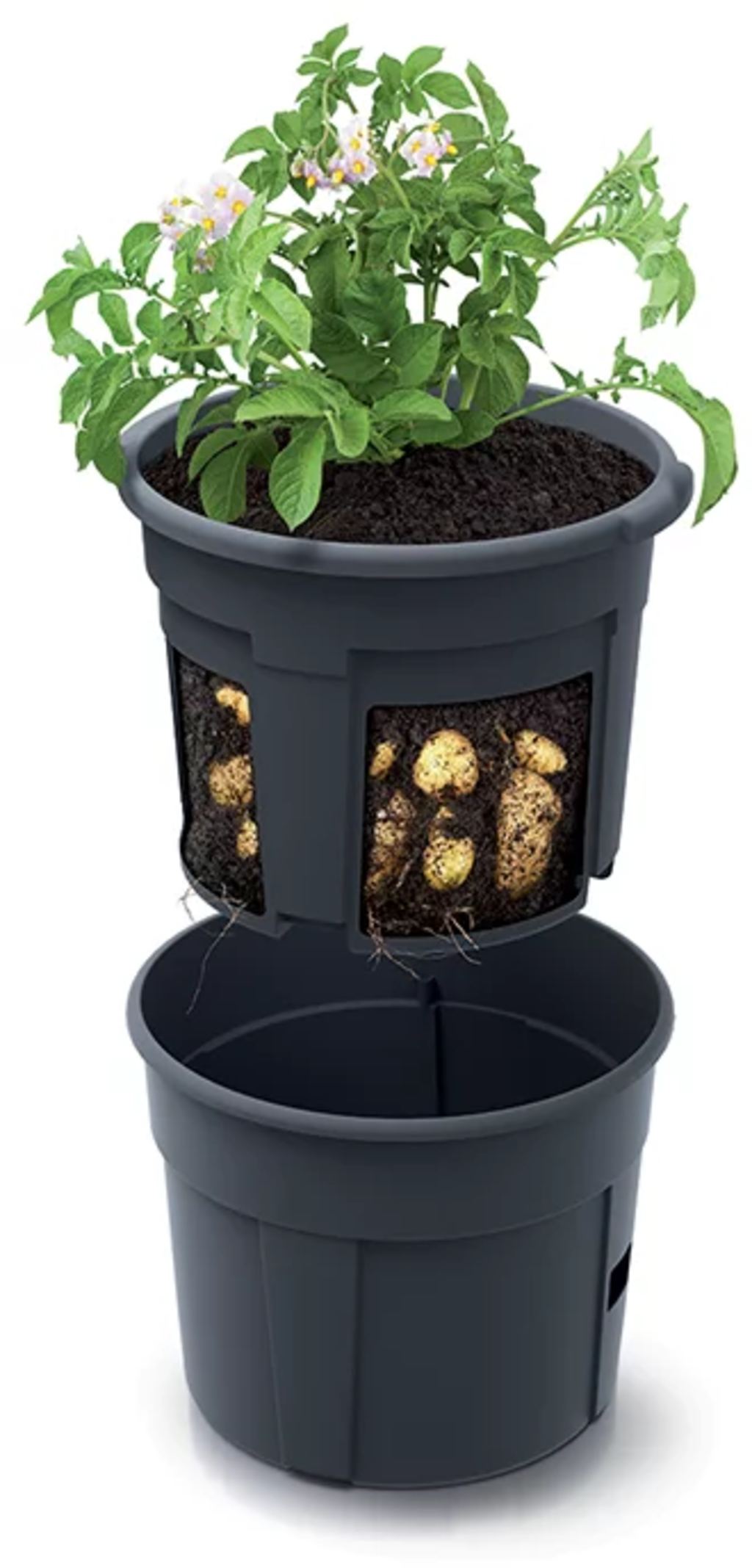 Odla enkelt dina egna ekologiska potatisar på balkongen - med denna smarta planteringskruka är det möjligt. Den genomtänkta 2-in-1-konstruktionen gör potatisodlingen smidig och ger dig när som helst insyn i hur långt dina potatisar har kommit i utvecklingen. Det är dessutom extra spännande för barn.
