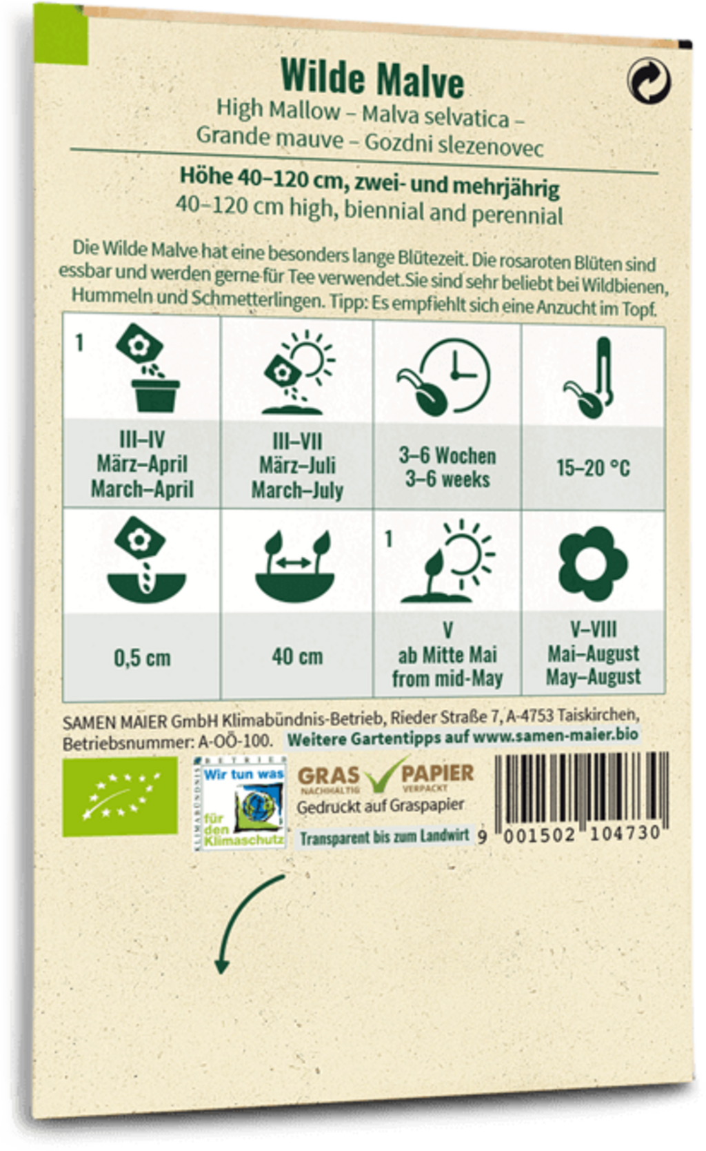 Vildblommor från Samen Maier är förpackade i gräspapper - ett hållbart och särskilt miljövänligt material som tillverkas utan kemikalier och med betydligt lägre energi- och vattenförbrukning. Gräset som används växer snabbt och är en förnybar råvara.