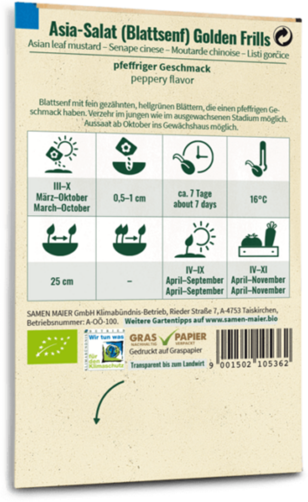 Med sin peppriga smak ger bladen från denna bladsenap varje sallad en särskilt god karaktär. Bladen är en smakupplevelse både som unga och fullt utvecklade. Eftersom sallaten växer snabbt kan du börja skörda de första bladen redan efter några veckor.