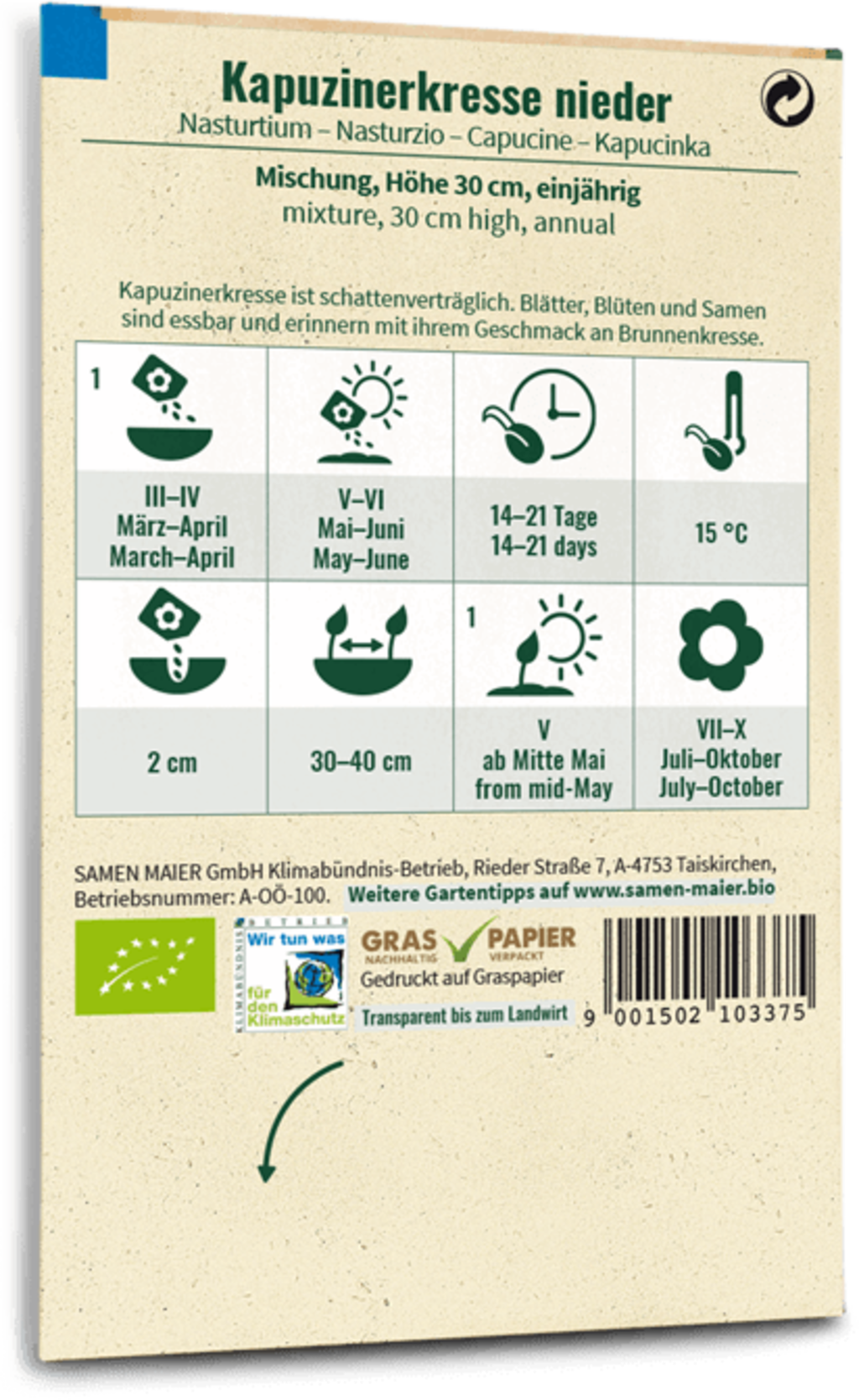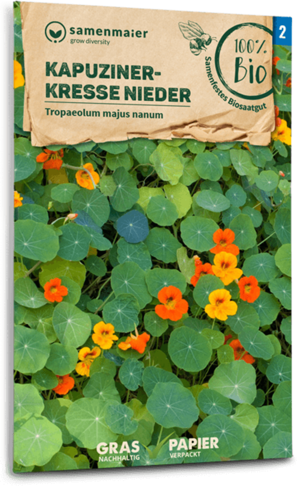 Krasse är lika vacker i rabatten som på tallriken. Både blad, blommor och frön är ätbara och smaken påminner om vattenkrasse. Denna sort håller sig lågväxande och blir cirka 30 cm hög. Klarar även skuggigare lägen bra.