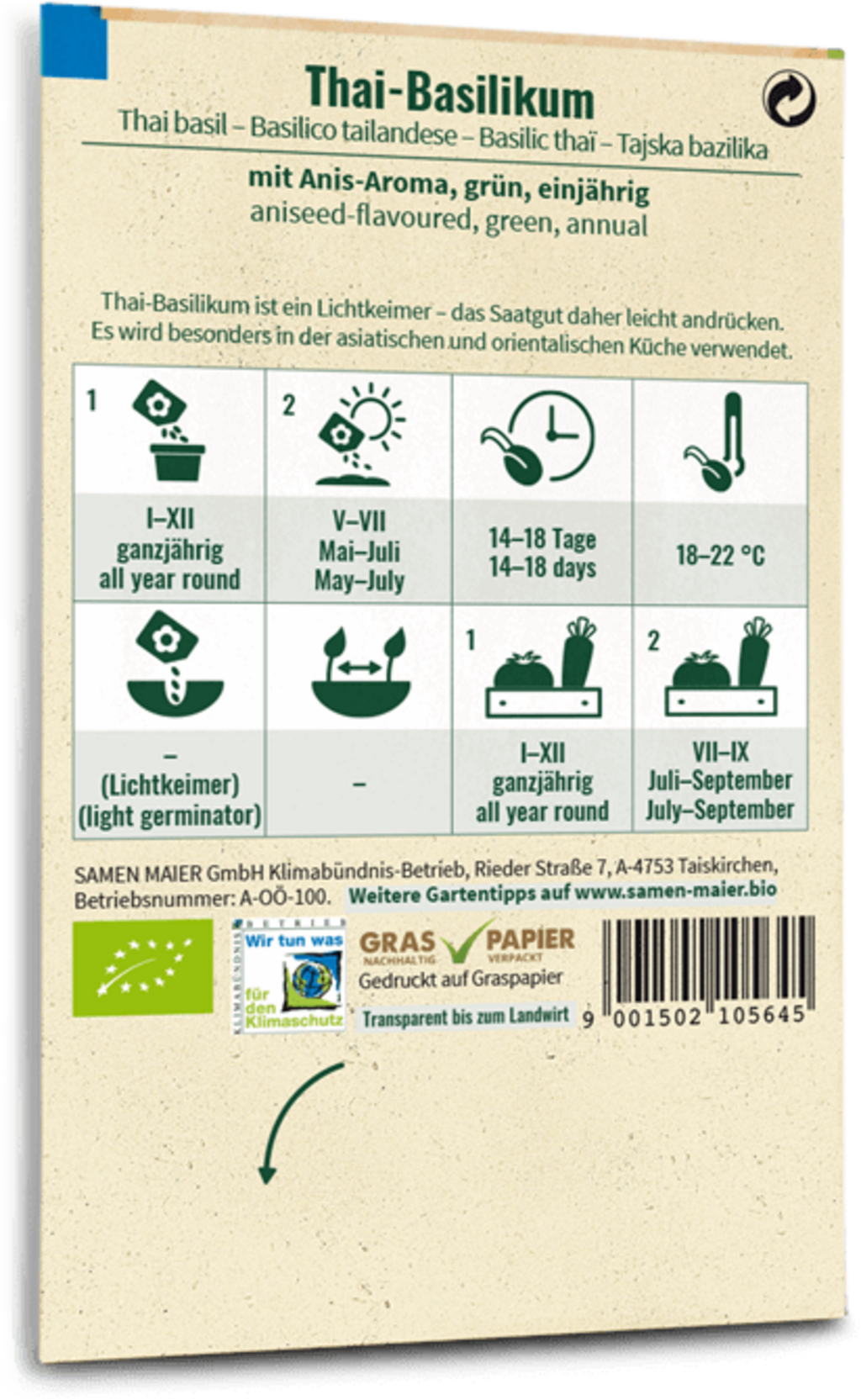 Thailändsk basilika har en fin smak av anis och passar perfekt i asiatisk och orientalisk matlagning. Eftersom den är ljusgroende ska fröna inte täckas med jord utan bara tryckas lätt ner.