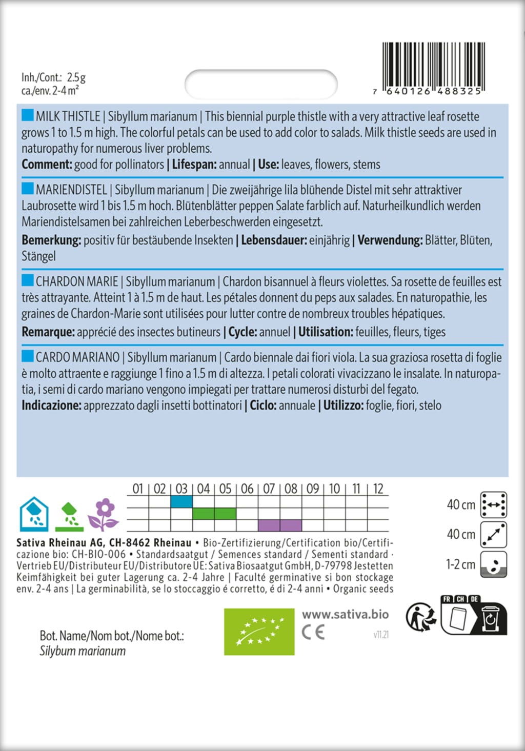 Den ettåriga mariatisteln kan bli upp till en och en halv meter hög. Den imponerande höjden och de starkt violetta blommorna ger växten ett majestätiskt utseende. Blombladen kan även användas som färgklick i sallader.