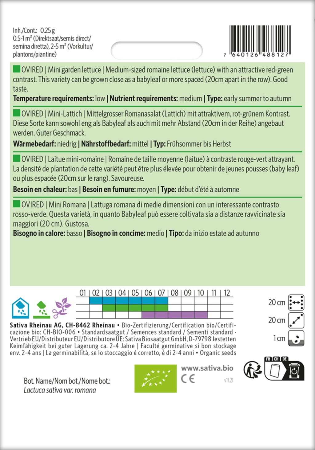 Mini-lattugen "Ovired" är en medelstor romansallat med vackert rödgröna blad och utmärkt smak. Den kan odlas både i rader eller som babyleaf.