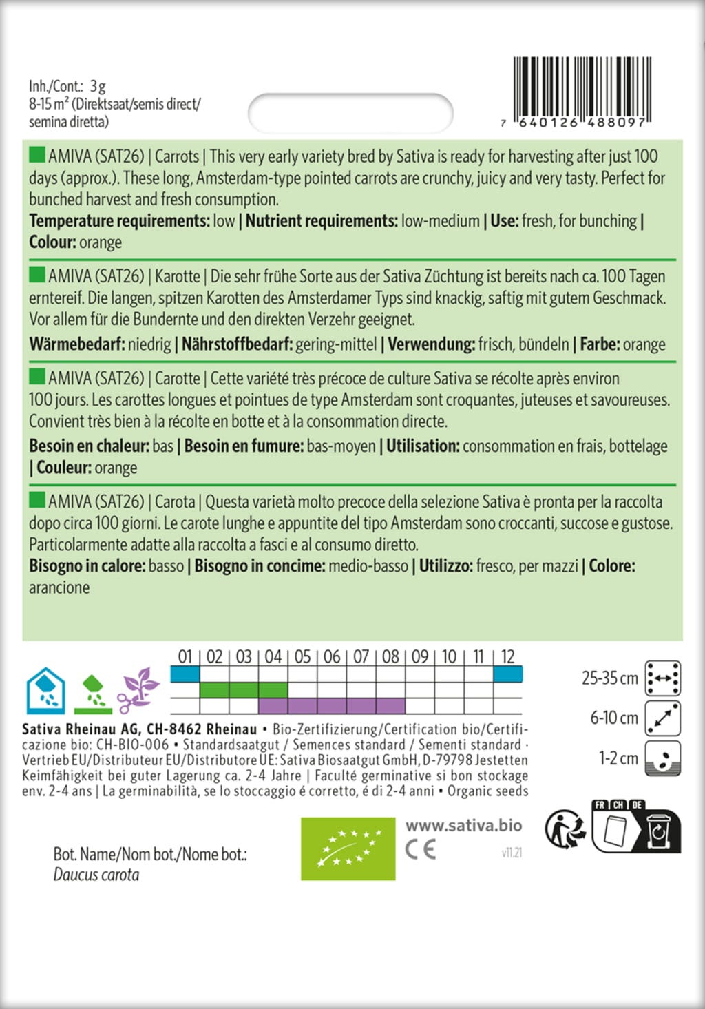 Moroten "Amiva" kan tack vare sin tidiga sådd skördas redan från april. Den behöver bara 100 dagar för att mogna. Formen är lång och spetsig, med ett saftigt och krispigt bett. Perfekt för buntar och direktkonsumtion.