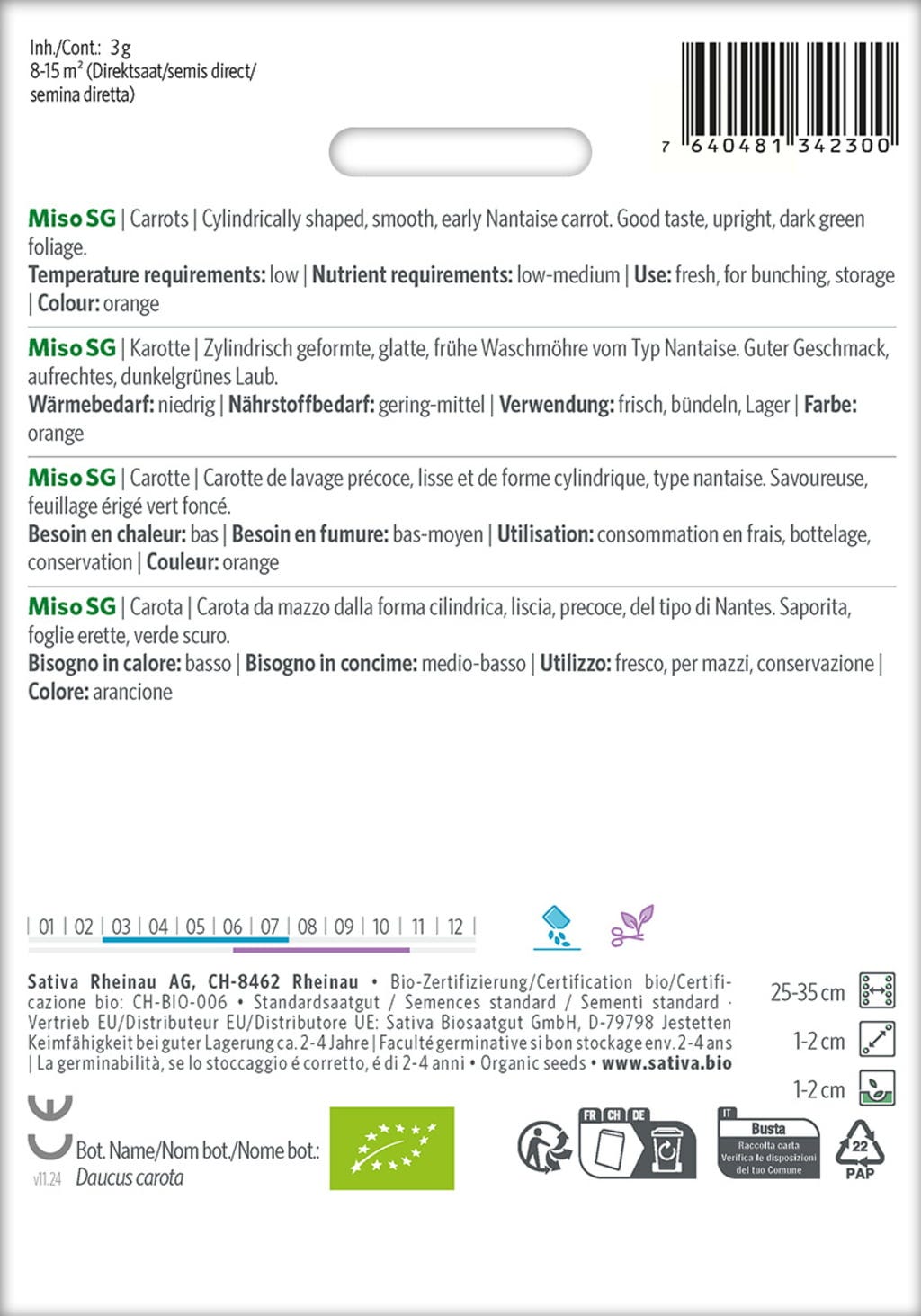 "Miso", Eko är en tidig, cylindrisk morotssort med slät rot och utmärkt smak. Det upprätta, mörkgröna bladverket kompletterar denna robusta och högavkastande sort perfekt.