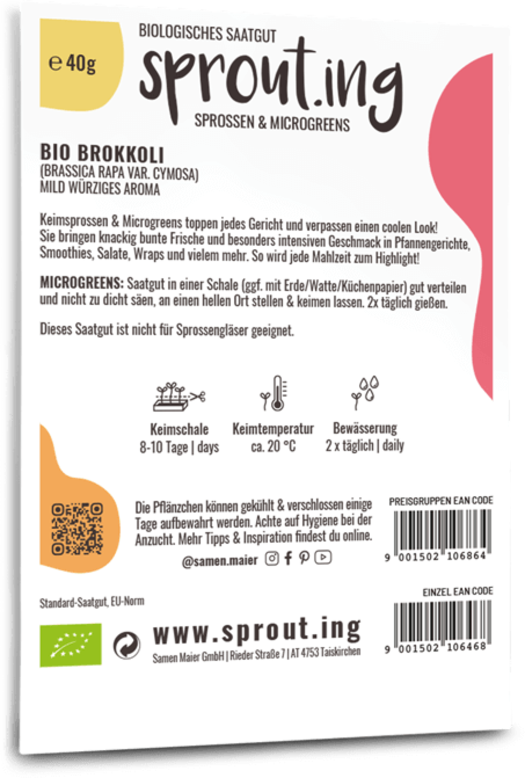 Broccolispiror har en delikat grön färg med livfulla, ljusgröna hjärtblad. Deras milda, nötiga, fräscha och behagligt aromatiska smak gör dem idealiska för bowls, smörgåsar, sallader, soppor, smoothies, asiatiska rätter eller som en färsk topping. Det som gör dessa mikrogrönsaker speciella är deras rikedom av värdefulla växtföreningar (t.ex. sulforafan), vilket gör dem till en riktig superfood i miniatyr.
