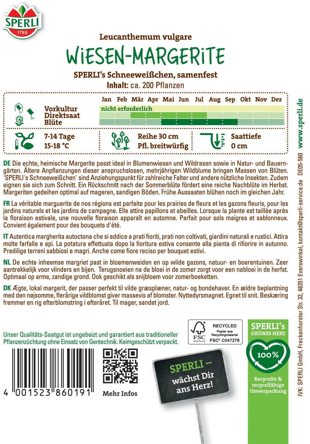 Den fleråriga ängsmargeriten ”Snövita” är idealisk för blomsterängar, naturlika trädgårdar och vildgräsmattor. Den får cirka 5 cm stora, klara vita blommor som är mycket omtyckta av insekter. Äldre plantor blommar extra rikligt och tål även att klippas. Lättskött, naturligt utseende och perfekt för en vildare trädgårdsstil.