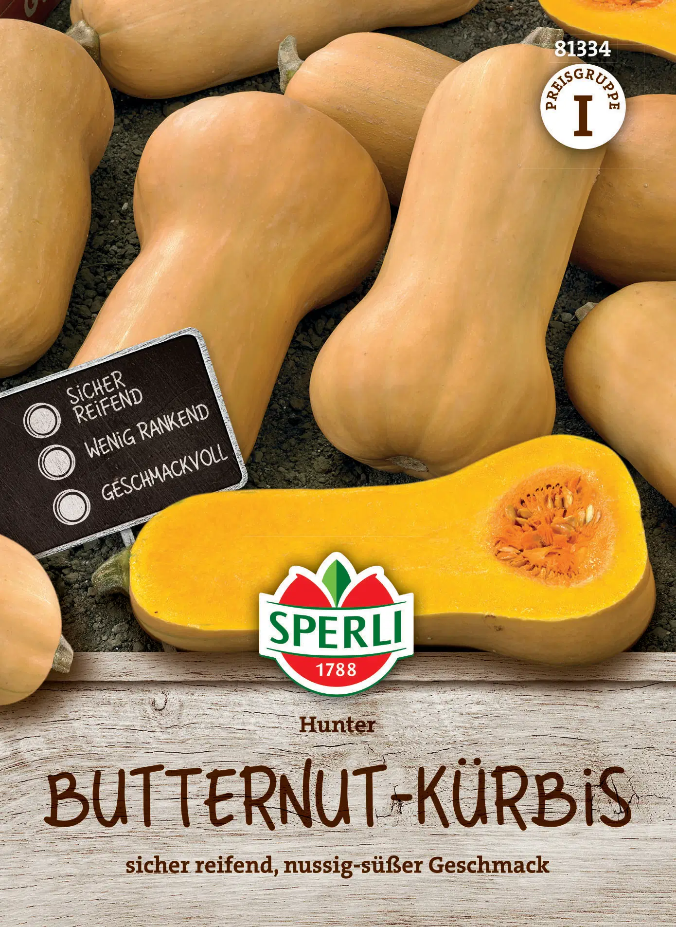 Butternutpumpan 'Hunter' imponerar med sin söta, nötiga smak och lysande orange frukter. Perfekt för soppor, gratänger eller pumpabröd - tålig, lättskött och perfekt för hobbyodlare som vill njuta av smakrika pumpor direkt från trädgården.
