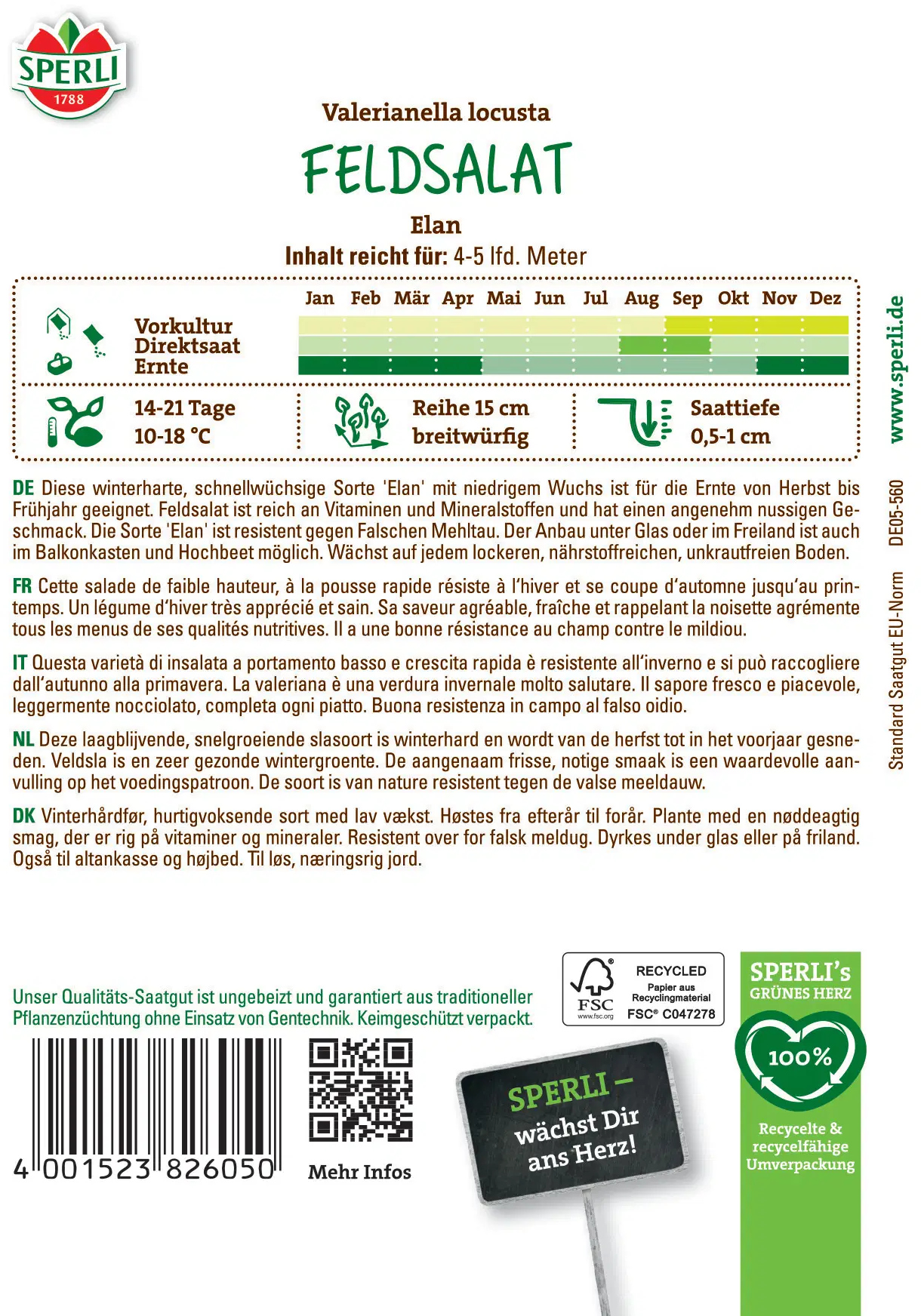 Fältsallat 'Elan' bjuder på krispigt färska blad direkt från trädgården eller krukan. Med sin nötiga smak passar den perfekt i sallader och vinterrätter - robust, vitaminrik och lättskött.