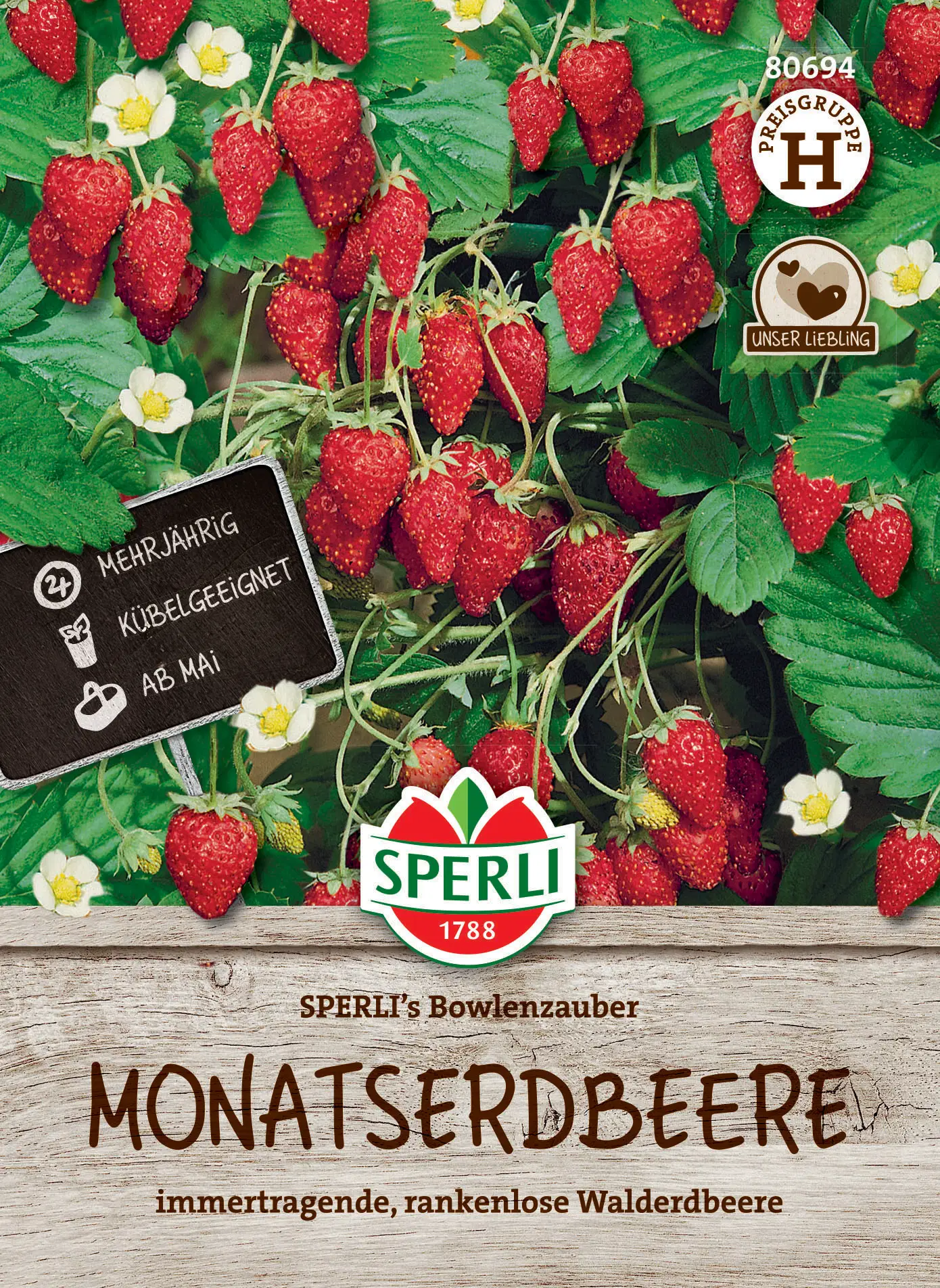 Månadsjordgubben 'Bowlenzauber' lockar med sina saftiga, röda frukter direkt från trädgården eller balkongen. Perfekt för dig som älskar att småäta och vill ha en dekorativ, lättskött planta som ger glädje i flera år.