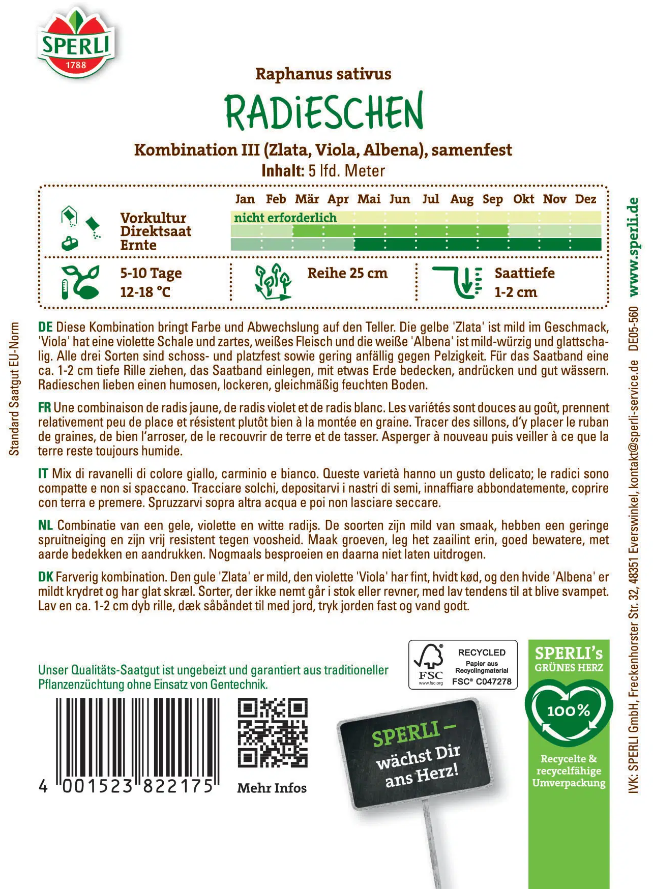 Med rädiseblandning III från SPERLI får du både färg och smak i odlingslådan! Tre sorter ger variation: ’Zlata’ med milda, gula knölar, ’Viola’ med lila skal och vitt inre, samt ’Albena’ med släta, vitglänsande och milt kryddiga rädisor. Det smarta såbandet gör det enkelt att så alla sorter på en gång – och från maj till november kan du njuta av en färgsprakande skörd.