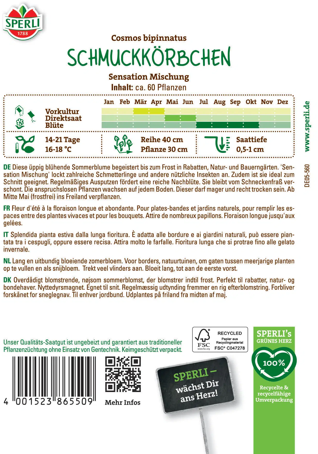 ”Sensation Blandning” består av ettåriga rosenskäror i vitt och rosarött. Plantorna växer graciöst, bildar stora, skira blommor och blir upp till 120 cm höga. Perfekta för rabatter, bakgrundsplanteringar eller som snittblommor i sommarbuketter. Mycket lättskötta och blommar rikligt.