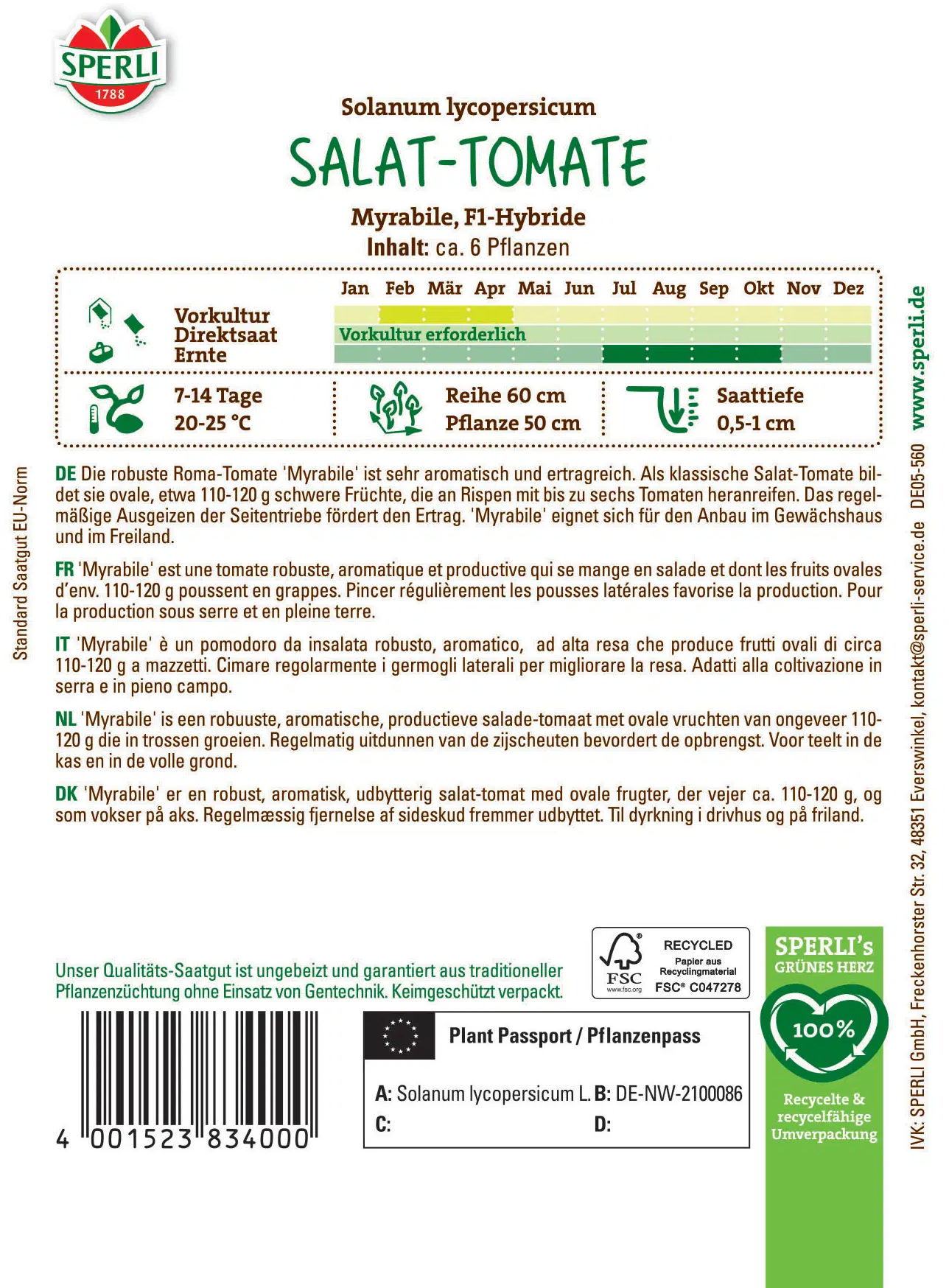 Romatomaten 'Myrabile' imponerar med fyllig smak och hög avkastning. De ovala frukterna väger 100–150 g och sitter i klasar med upp till sex tomater. Som en indeterminant sort växer plantan kontinuerligt och ger skörd hela säsongen. Passar utmärkt både i växthus och på friland – robust, lättskött och perfekt till sallader, såser eller att äta direkt från plantan.