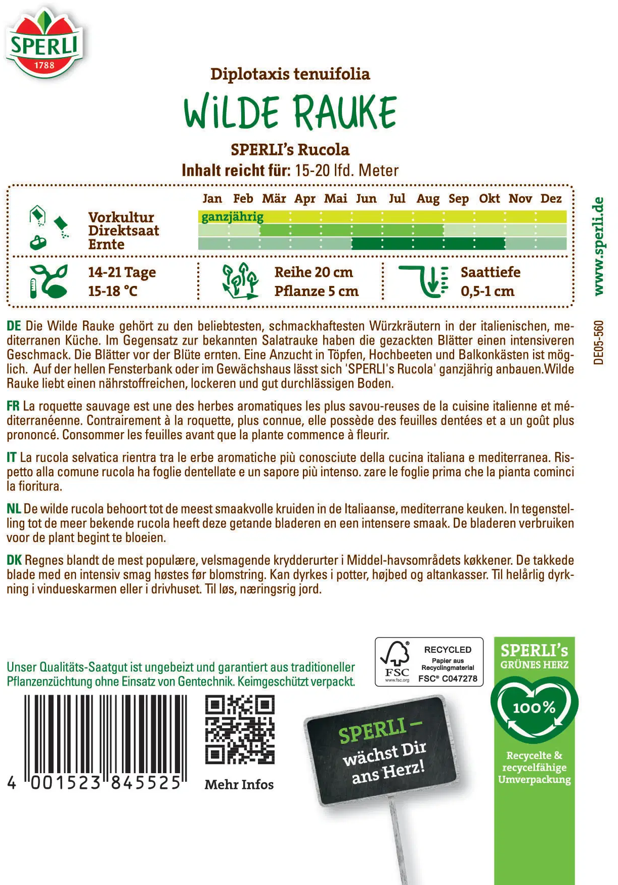 Vildrucolan SPERLI’s Rucola bjuder på kraftfull, lätt pepprig smak och vackert flikiga blad. Den passar perfekt i medelhavsmat - som fräsch sallad, smakrik sidorätt eller aromatisk topping.