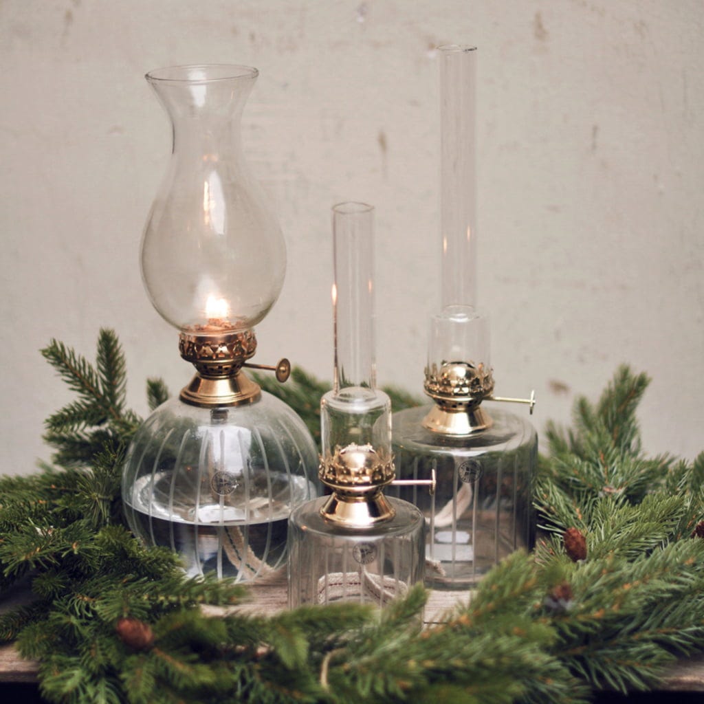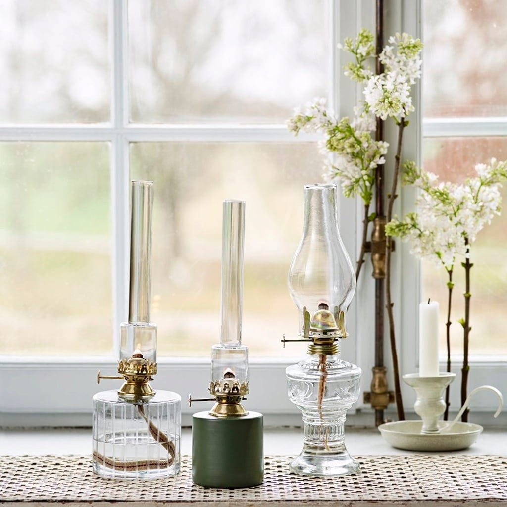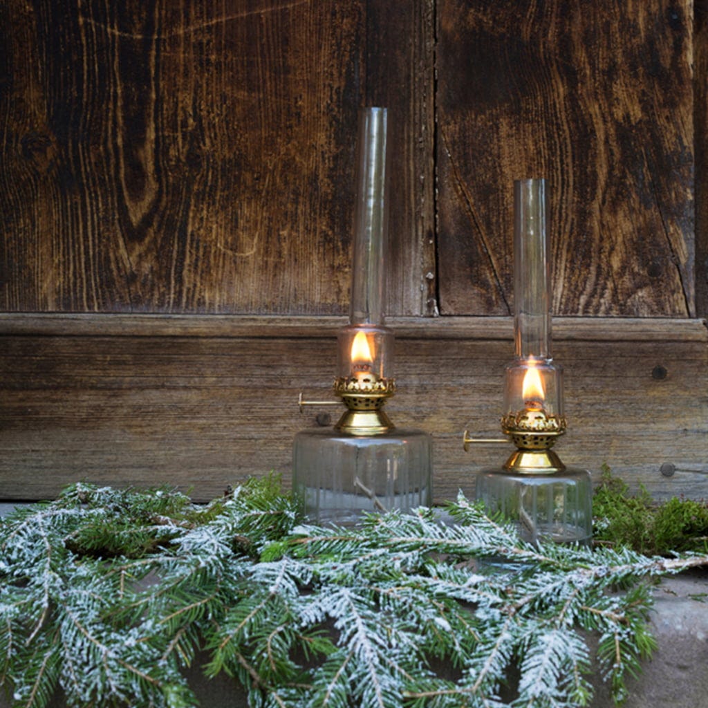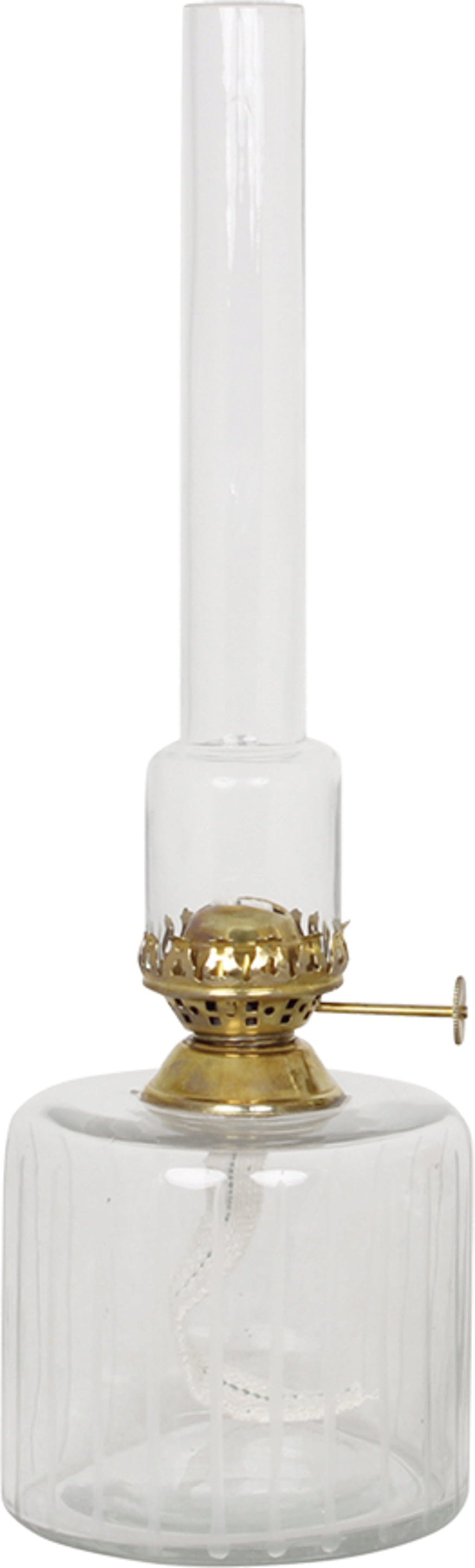 Denna ljuvliga fotogenlampa är tillverkad i glas. Ett riktigt blickfång är brännaren med sin antikbehandlade mässingsfinish. Lampan fylls med särskild lampolja. Veken tänds och ljusstyrkan justeras enkelt med hjälp av vredet på sidan.