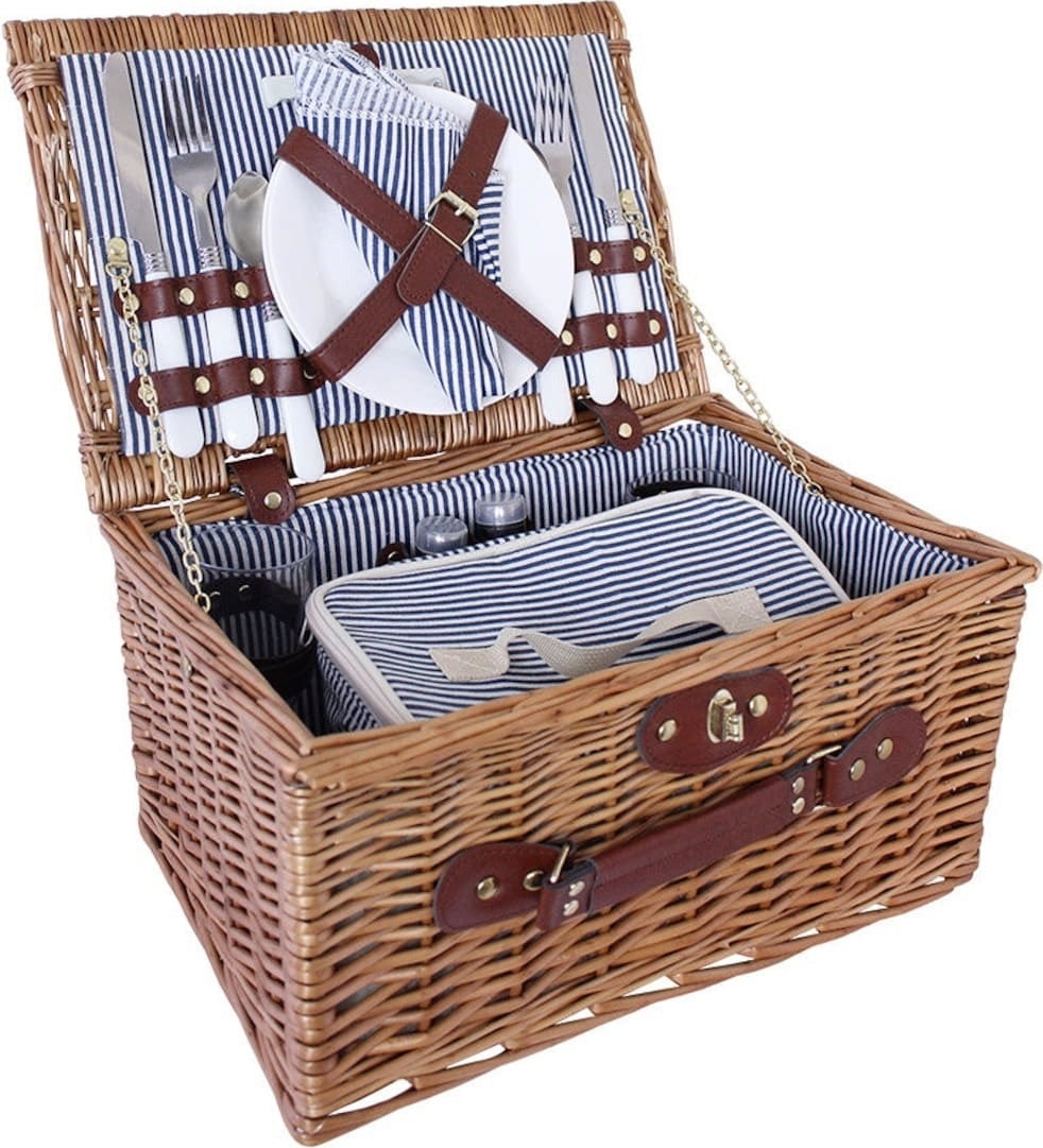 Picknickkorgen är omsorgsfullt flätad och fodrad med blå randigt tyg på insidan – perfekt för mysiga stunder i parken, på stranden eller i trädgården. Den rymmer allt du behöver för mat och dryck och kombinerar stil med praktisk funktion för varje utflykt.