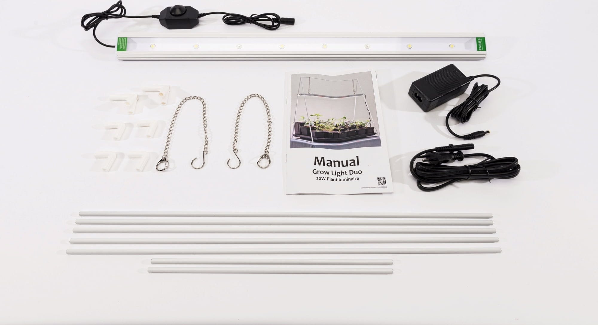 Den praktiska förodlingslampan ”GrowLight Duo” har vita och röda LED-lampor som ger optimalt ljus för småplantor och sticklingar. Med den inbyggda dimmern kan ljusstyrkan enkelt anpassas efter växternas utvecklingsstadium. Ljusrampen fästs i det medföljande aluminiumstativet, där avståndet till växterna justeras smidigt med hjälp av kedjor. Kombinationen av de två ljusfärgerna stödjer en jämn utveckling av rötter, skott och blommor - för starka växter och glada odlare.