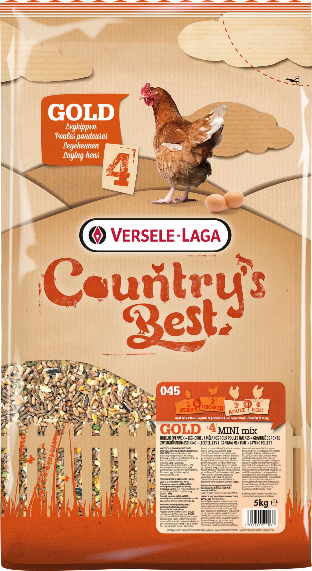 Gold 4 MiniMix är ett komplett foder som förser dvärghöns från 18 veckor och under hela värpperioden med alla nödvändiga vitaminer och mineraler för regelbunden äggläggning och starka äggskal. Det smakrika fodret består av en spannmålsblandning och 2 mm stora värppellets. Det innehåller inga koccidiostatika.
