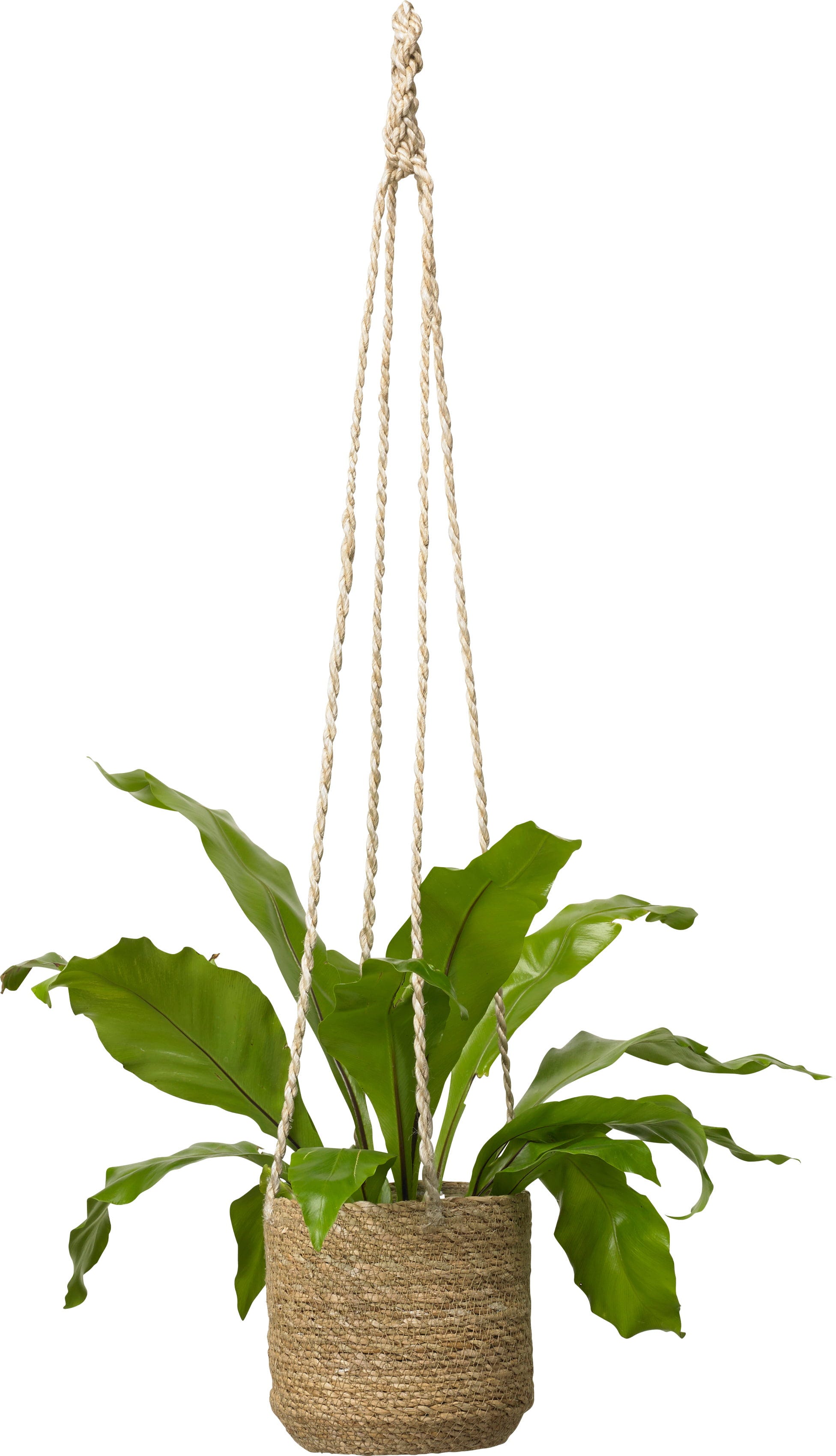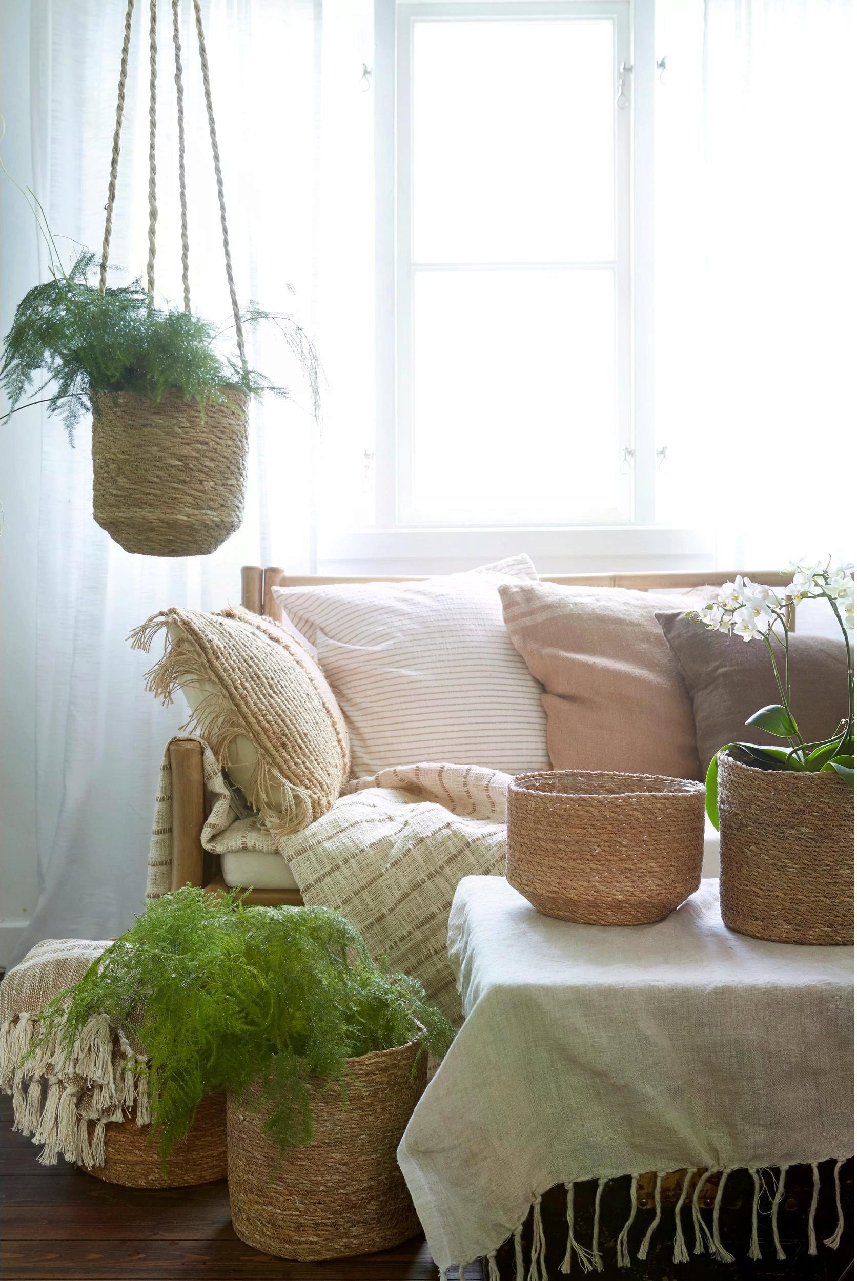 Denna hängande kruka i flätat sjögräs charmar med sin boho-chic-stil och är ett perfekt komplement till inredningar som kombinerar stil med hemtrevnad.