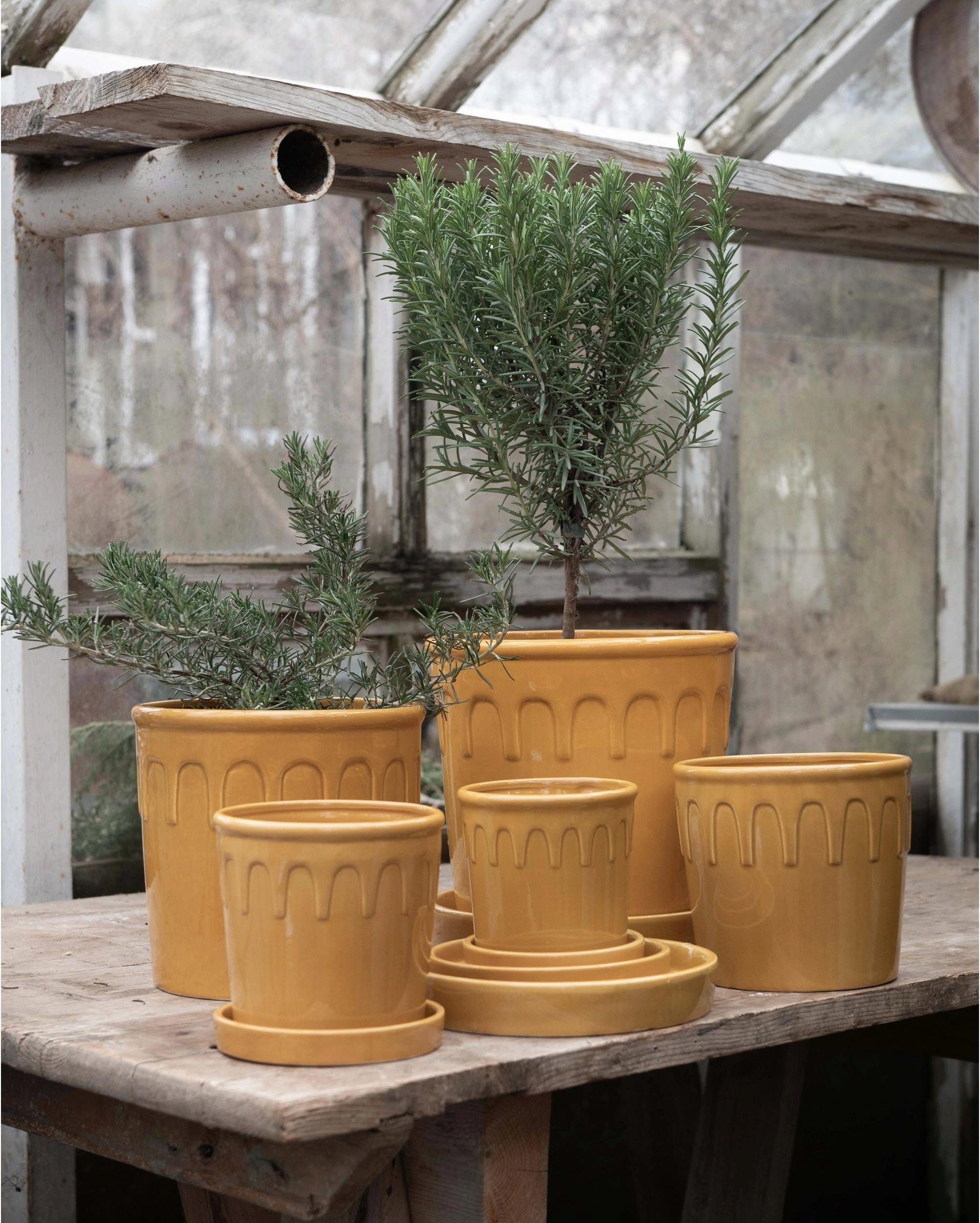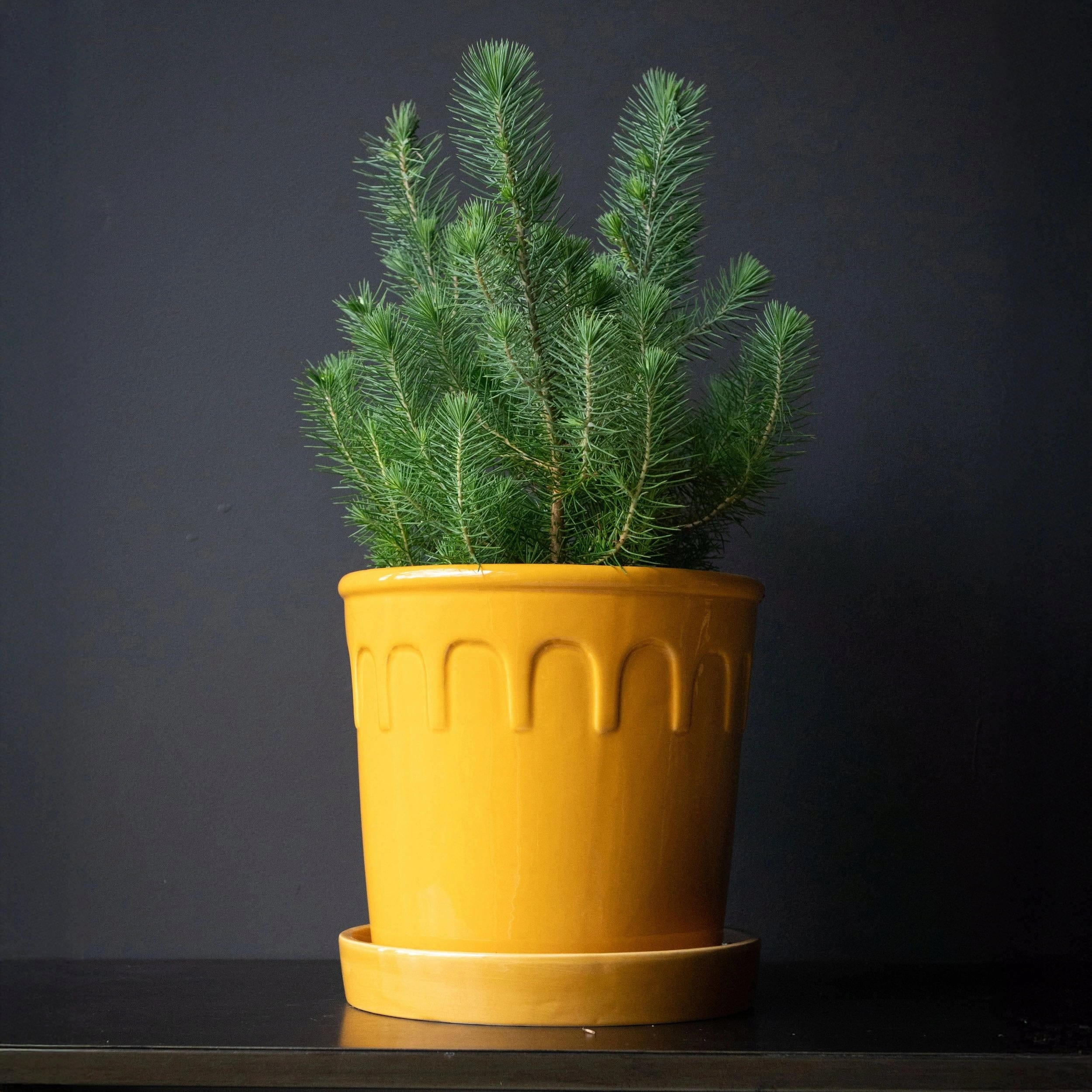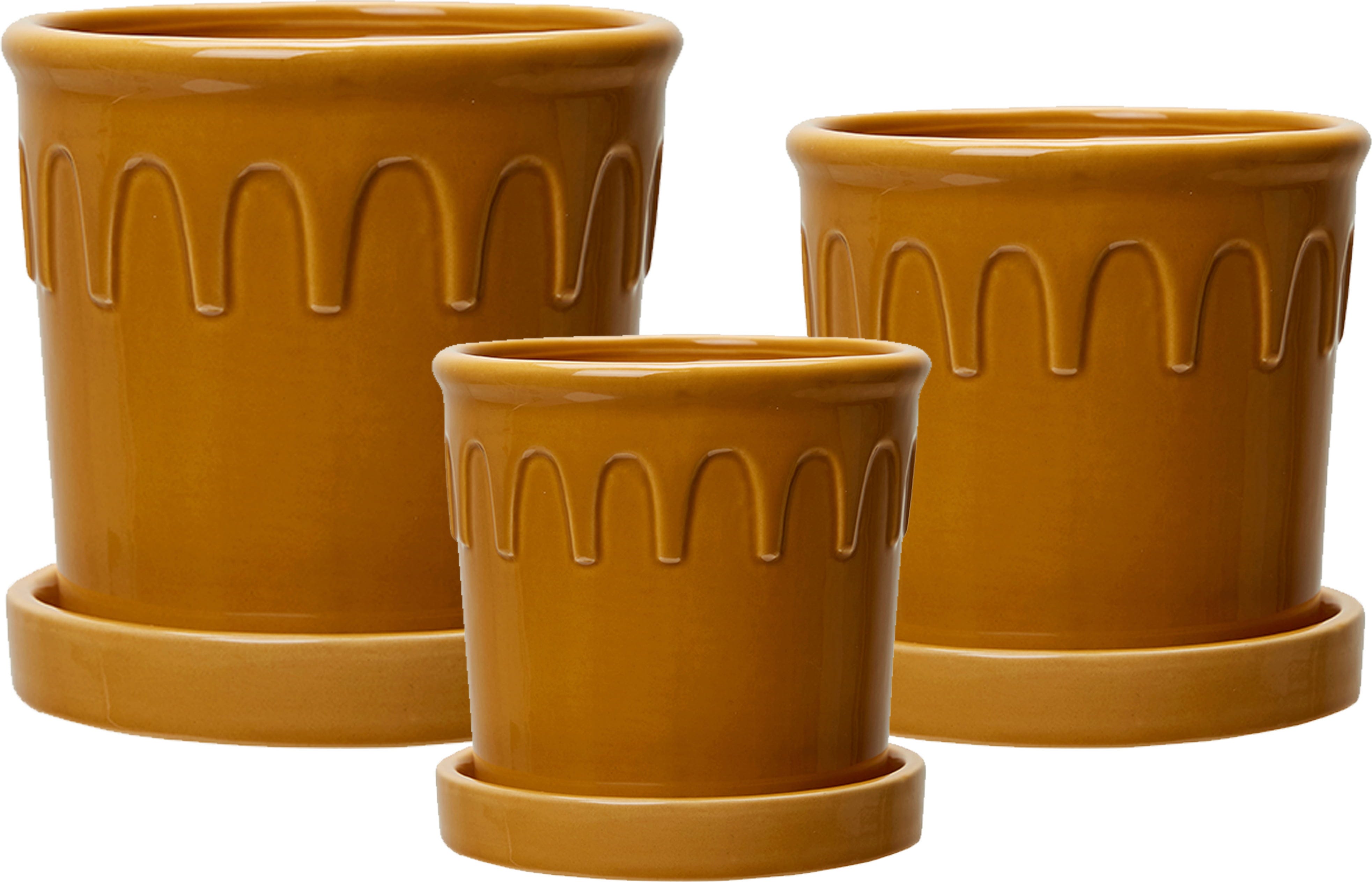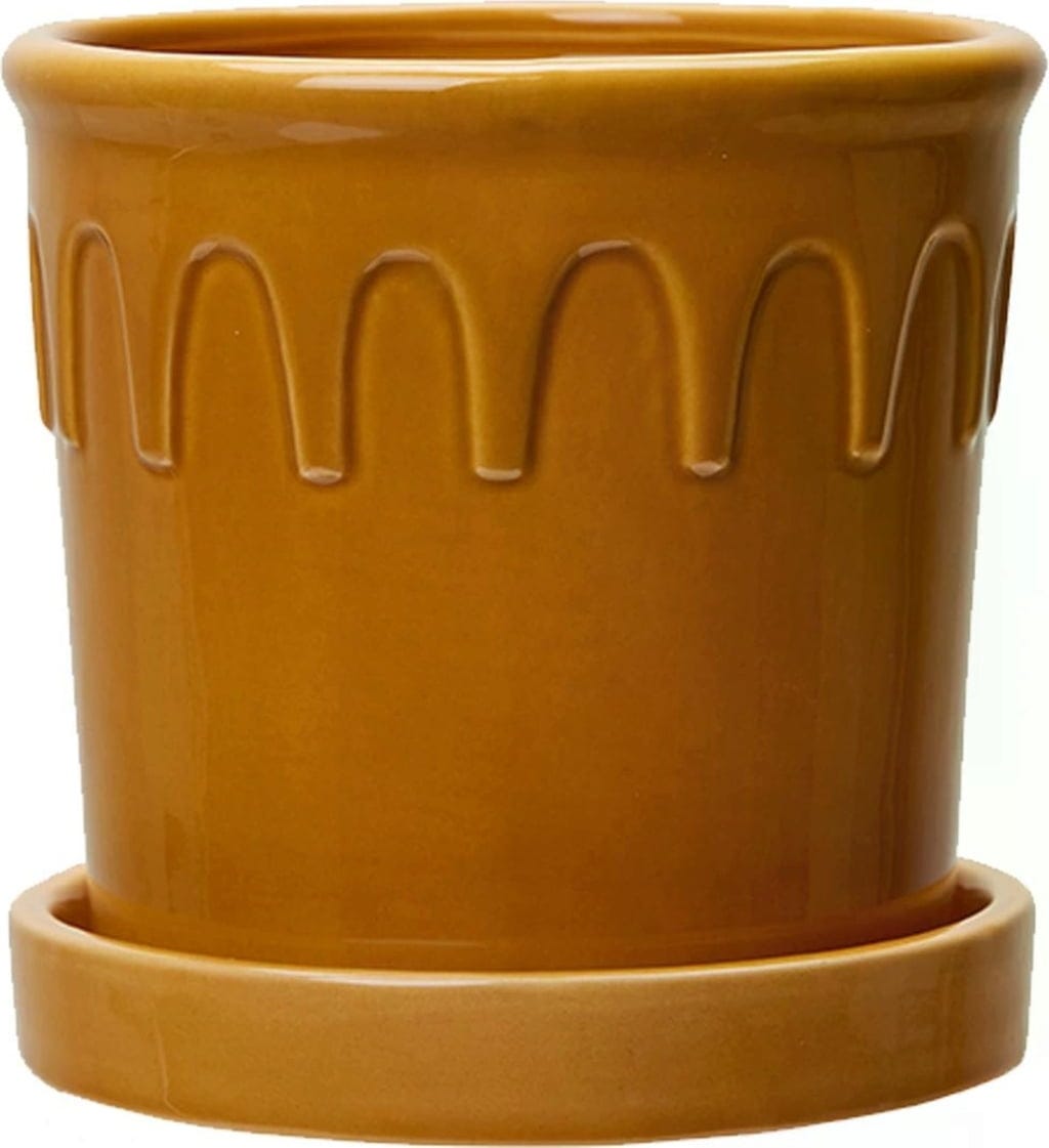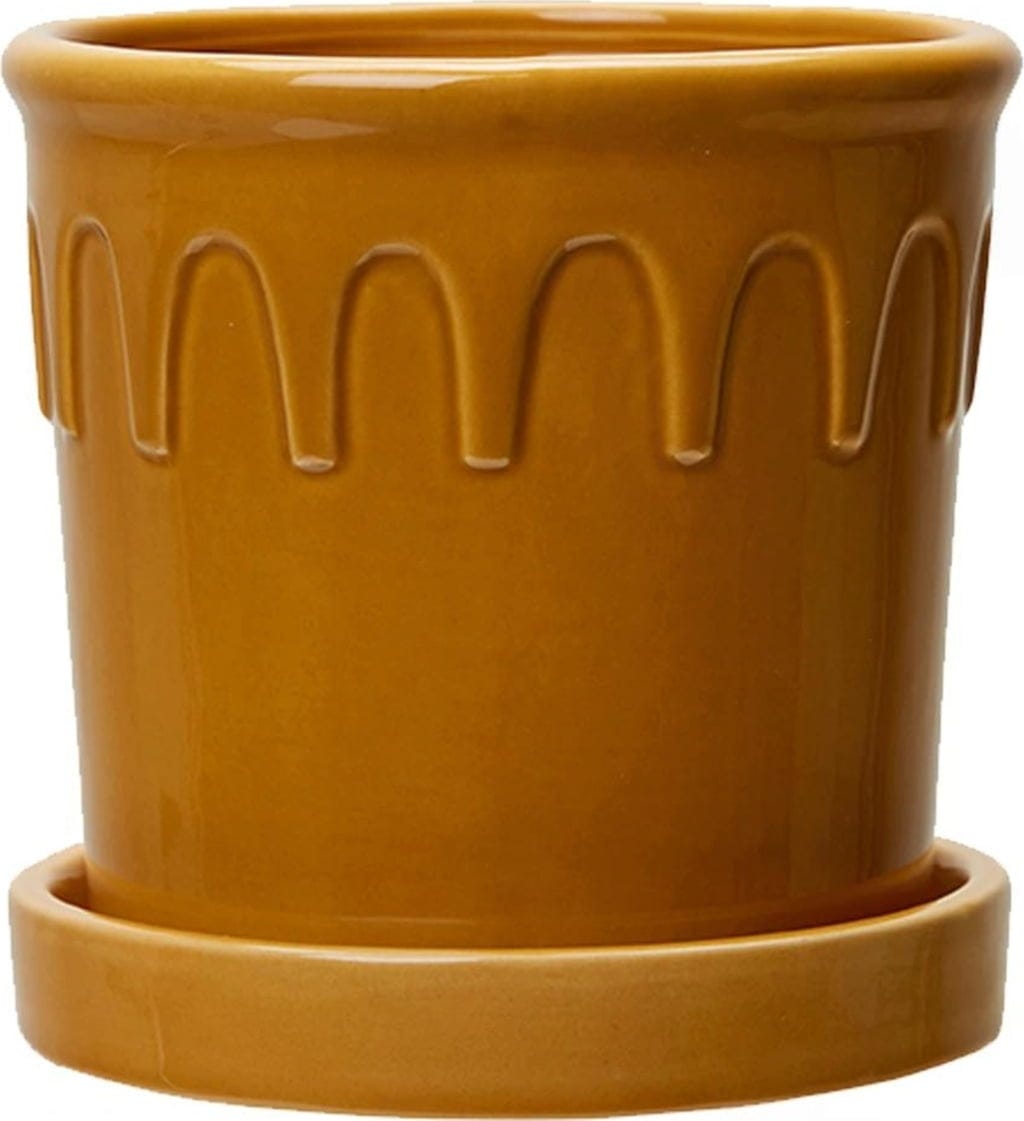Med sin vackra gula färg framhäver dessa ytterkrukor det gröna i mindre växter på ett särskilt effektfullt sätt. Designen kombinerar moderna inslag med diskreta vintage-detaljer, vilket gör dem till stilfulla blickfång i hemmet.