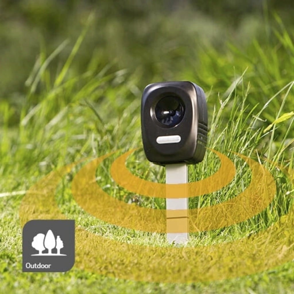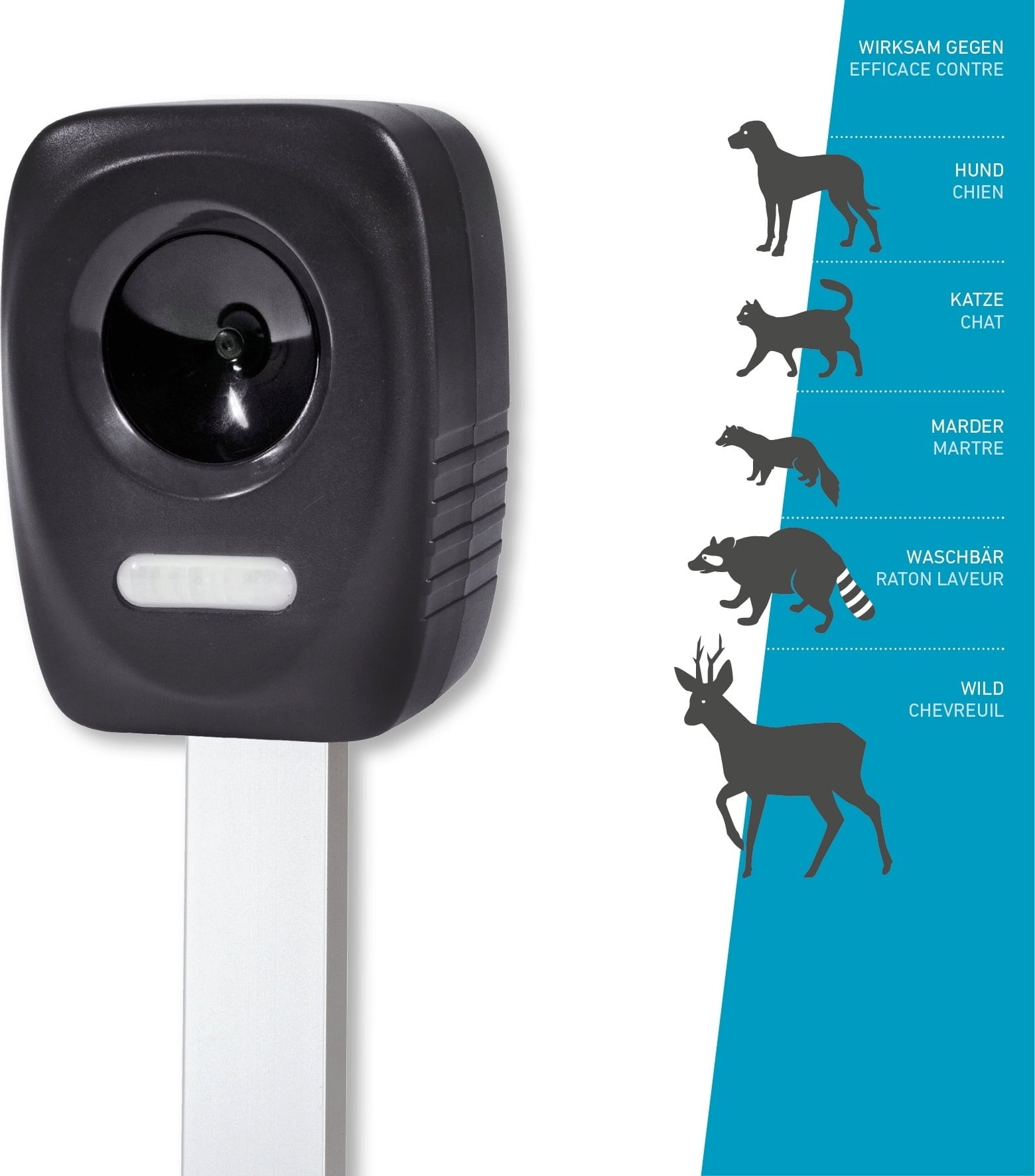 Den här enheten skrämmer bort oönskade fyrbenta gäster i trädgården med hjälp av ultraljudsvågor som knappt uppfattas av människor, men som är obehagliga för djur. Den inbyggda IR-rörelsesensorn aktiverar ultraljudet i valda intervaller [0-3] inom ett frekvensområde på 17 till 23 kHz.