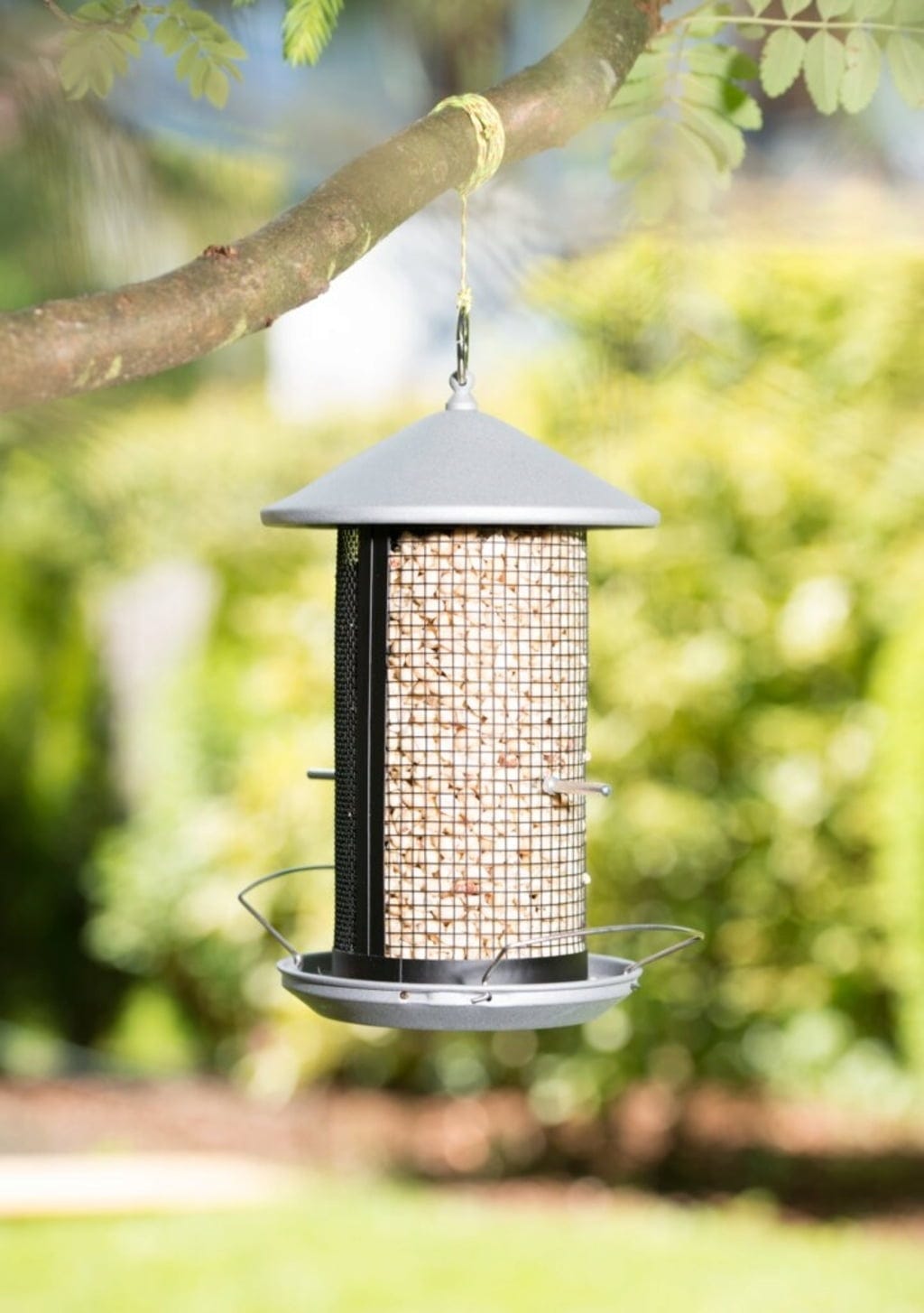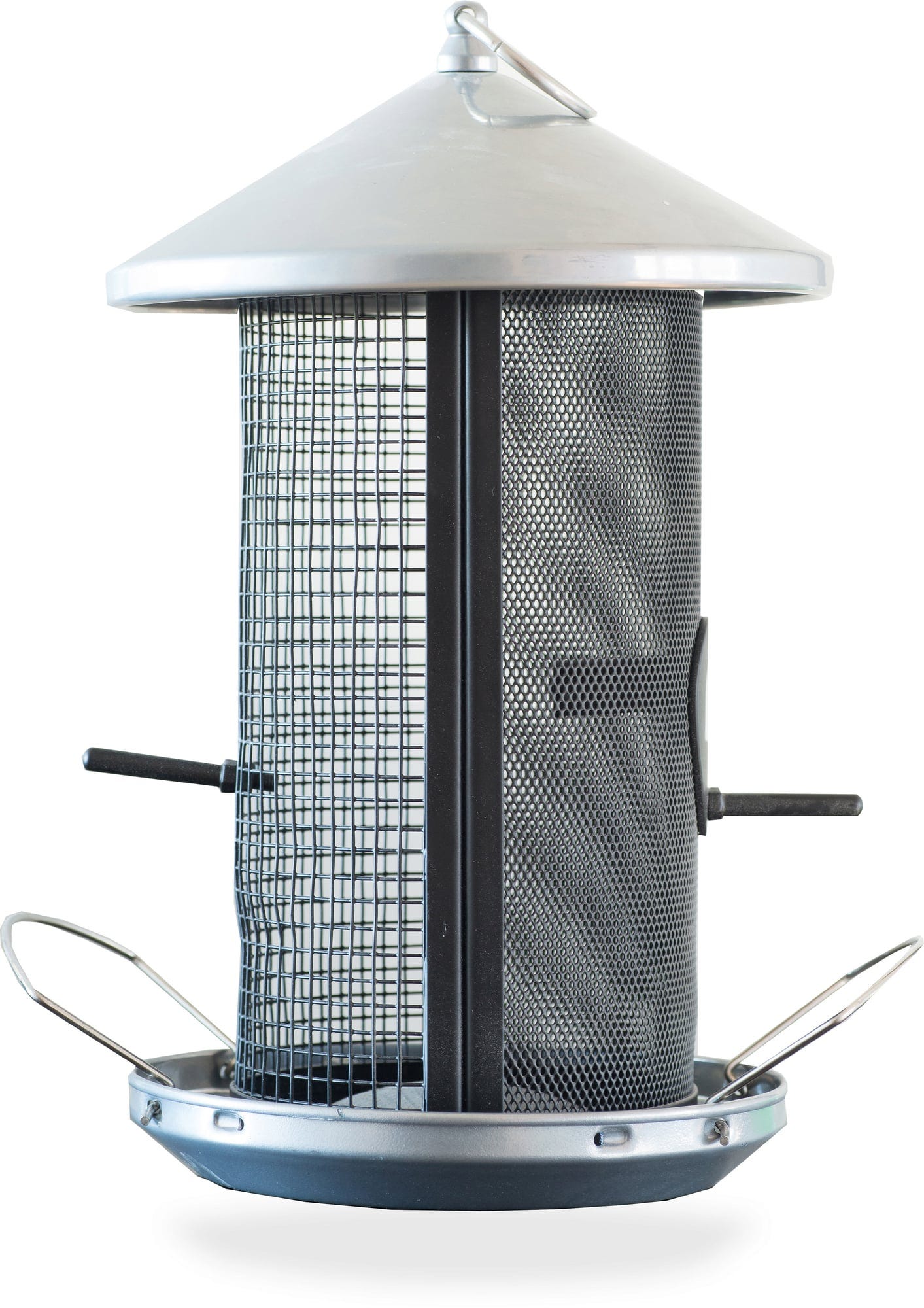 Detta extra väderbeständiga fågelfodersilo håller i många vintrar framöver. Det har två separata foderkammare och passar därför både för större frön (t.ex. nötbitar, solrosfrön) och mindre foder. Dräneringshål i foderskålen leder bort vatten och håller fodret torrt. Modern design i svart och silverlack.
