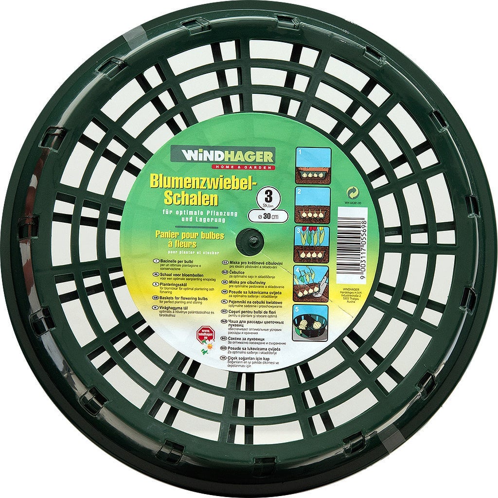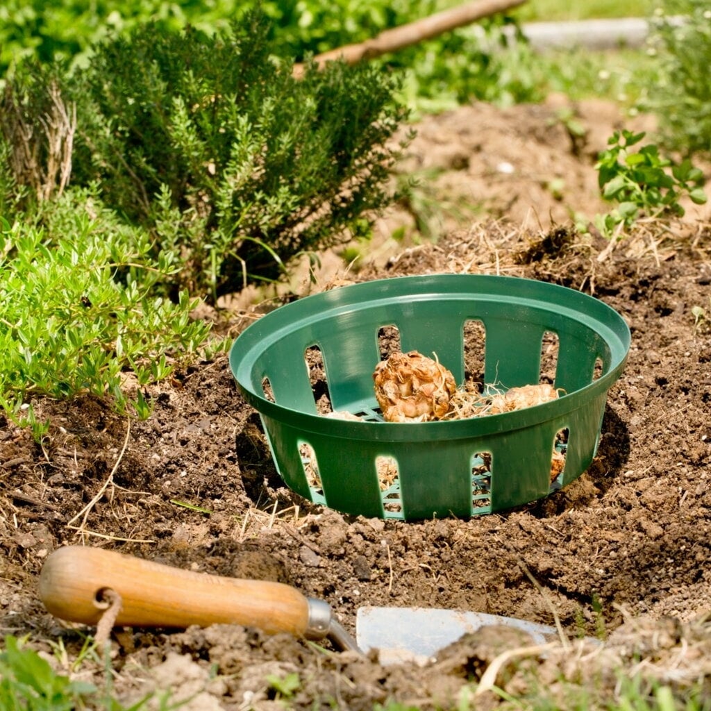 Den här lökskålen förenklar både plantering och upptagning av blomsterlökar. Lökarna planteras direkt i skålen, grävs upp efter blomningen och kan enkelt torkas och staplas. Dessutom ger den ett tillförlitligt skydd mot sorkar.