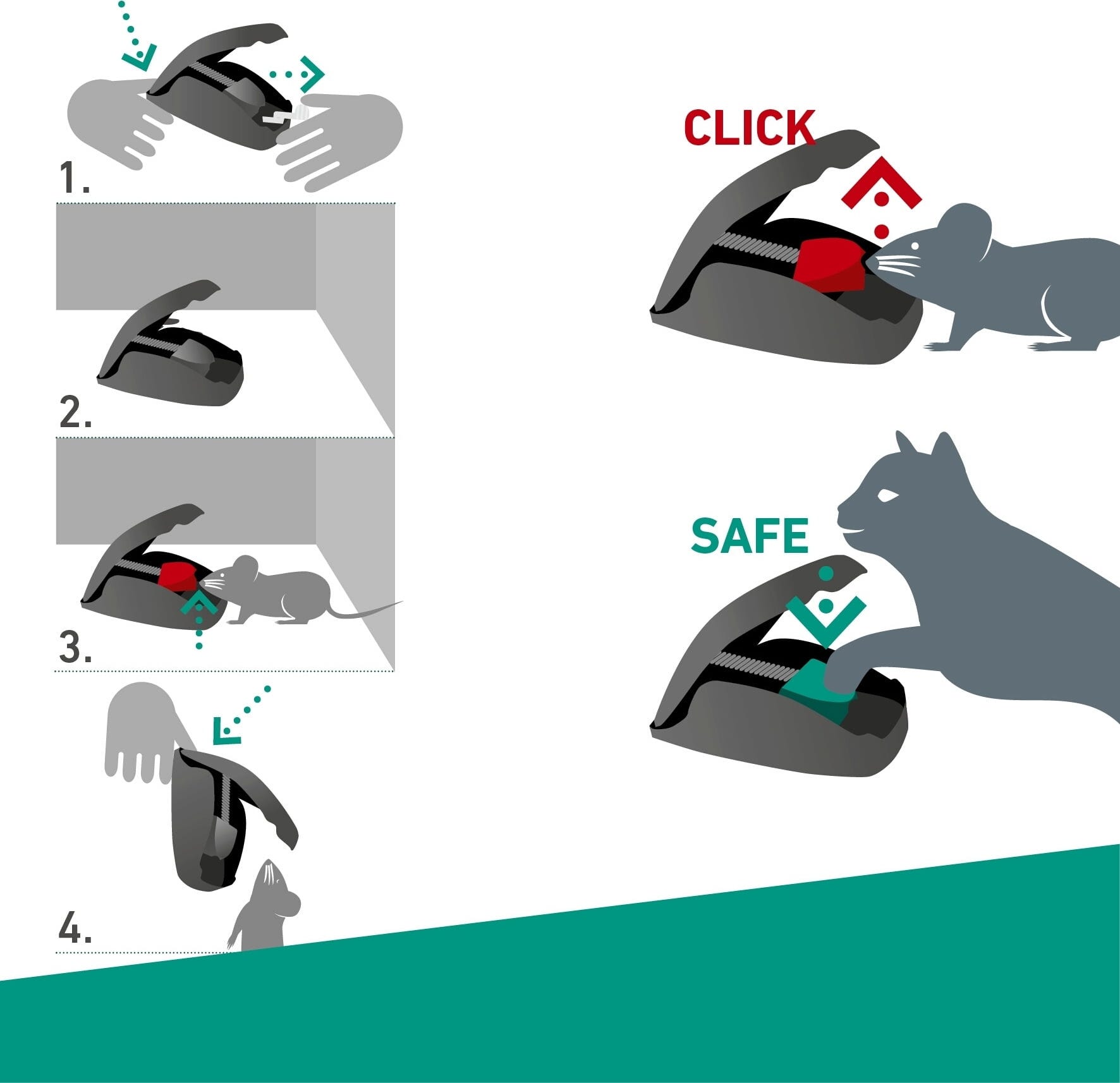 Oroa dig inte, katten tar ingen skada om den råkar sätta tassen i fällan. Fångstmekanismen aktiveras först när locket, under vilket betet ligger, lyfts upp. Genom att trycka på punkten spänns fällans fjäder. Sedan behöver du bara försiktigt ta bort det vita locket så att musen når det förfyllda specialbetet. Därefter kan du enkelt tömma fällan, utan att röra musen, genom att åter spänna fjädern.