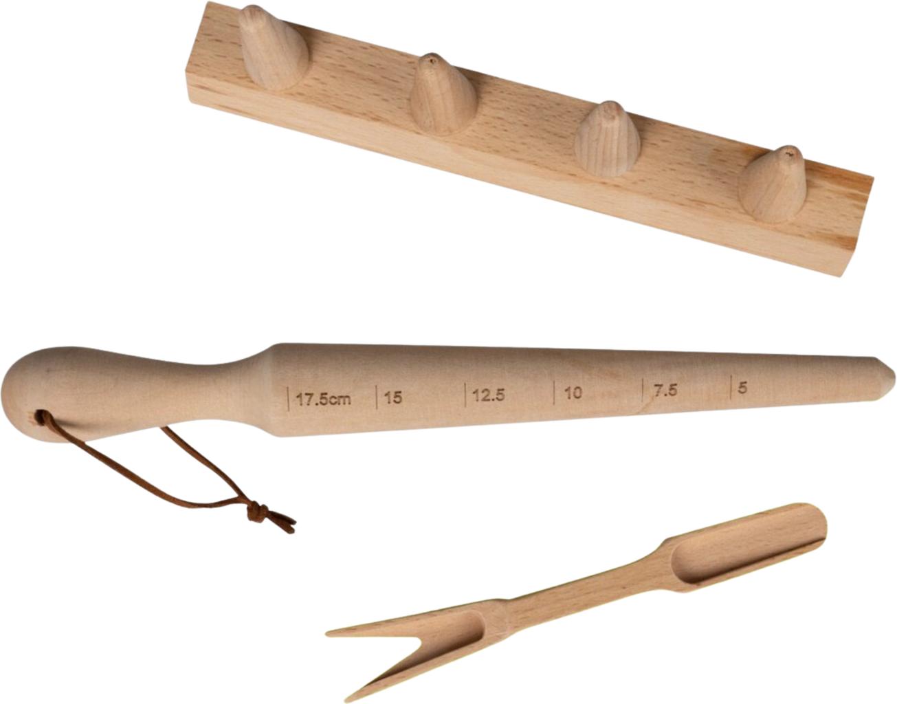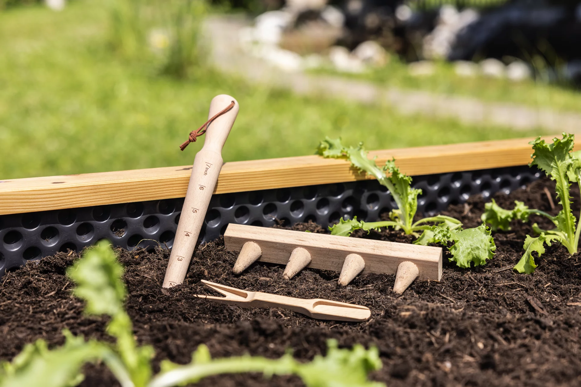 Detta planteringsset hjälper dig vid sådd och förodling av egna växter. Med det praktiska planteringsverktyget kan du enkelt göra hål i jorden för lökar eller större småplantor, och med hjälp av måttskalan sätter du dem på rätt djup. Pikierlisten pressar ut fördjupningar i jorden med jämnt avstånd, perfekt vid direktsådd. Pikiersleven har flera funktioner: den lilla skopan används för att fylla och trycka till jorden, medan gaffeln är perfekt för att försiktigt plantera om plantor utan att skada rötterna.