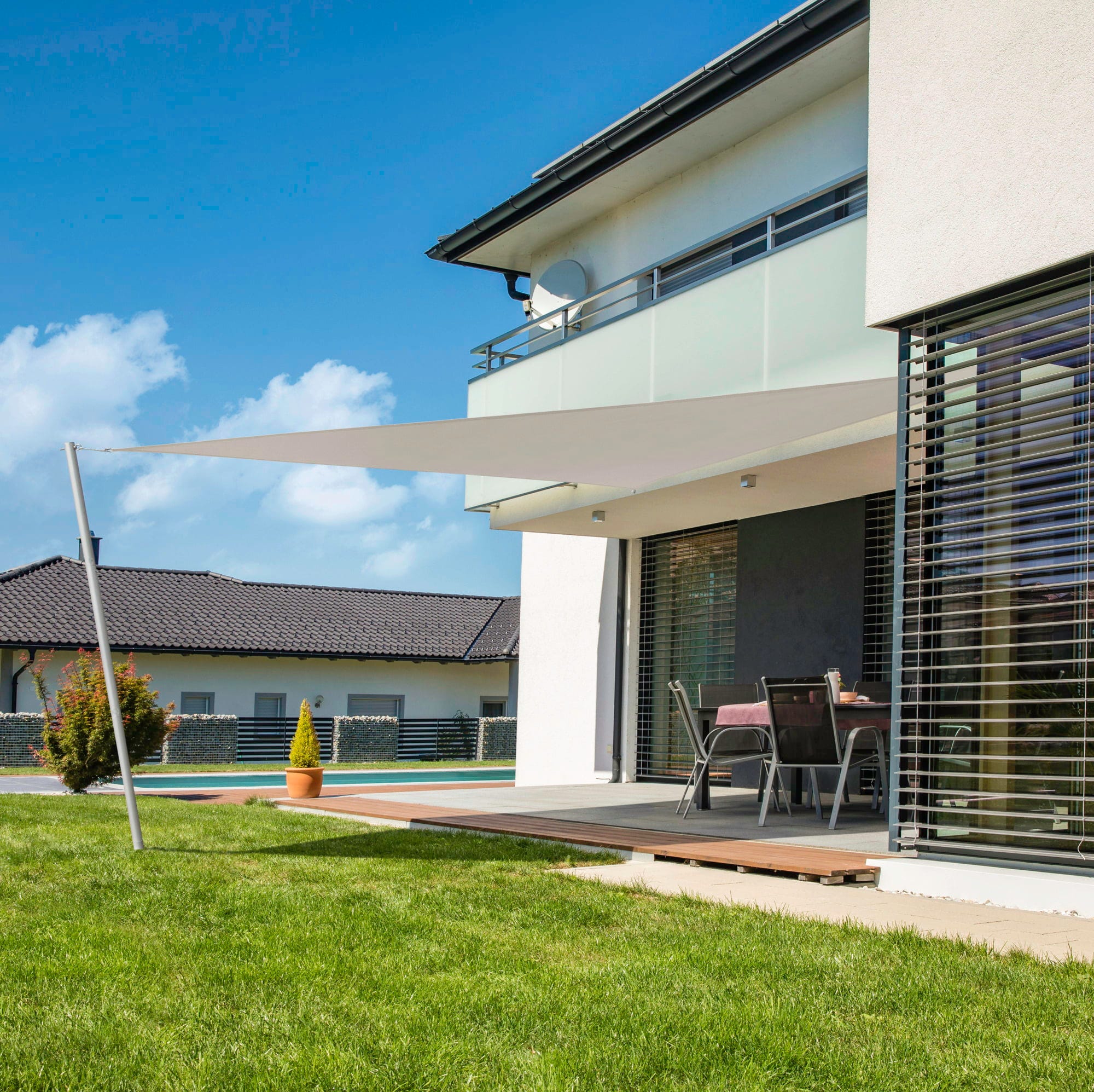 Till skillnad från parasoller tar det ingen plats på marken, samtidigt som det skyddar effektivt mot solens strålar. Tack vare det rivstarka och vädertåliga materialet får du ett segel som håller länge. Den perfekta skuggplatsen, år efter år.