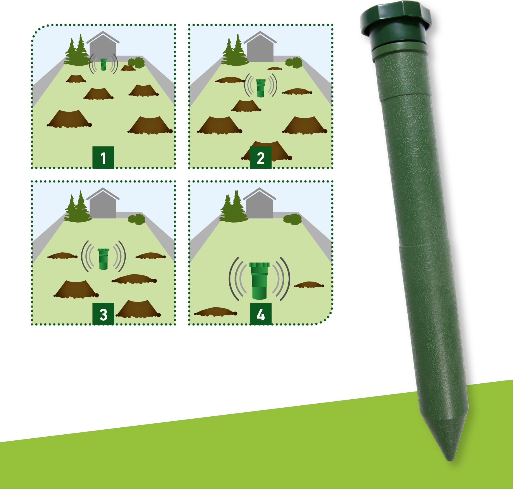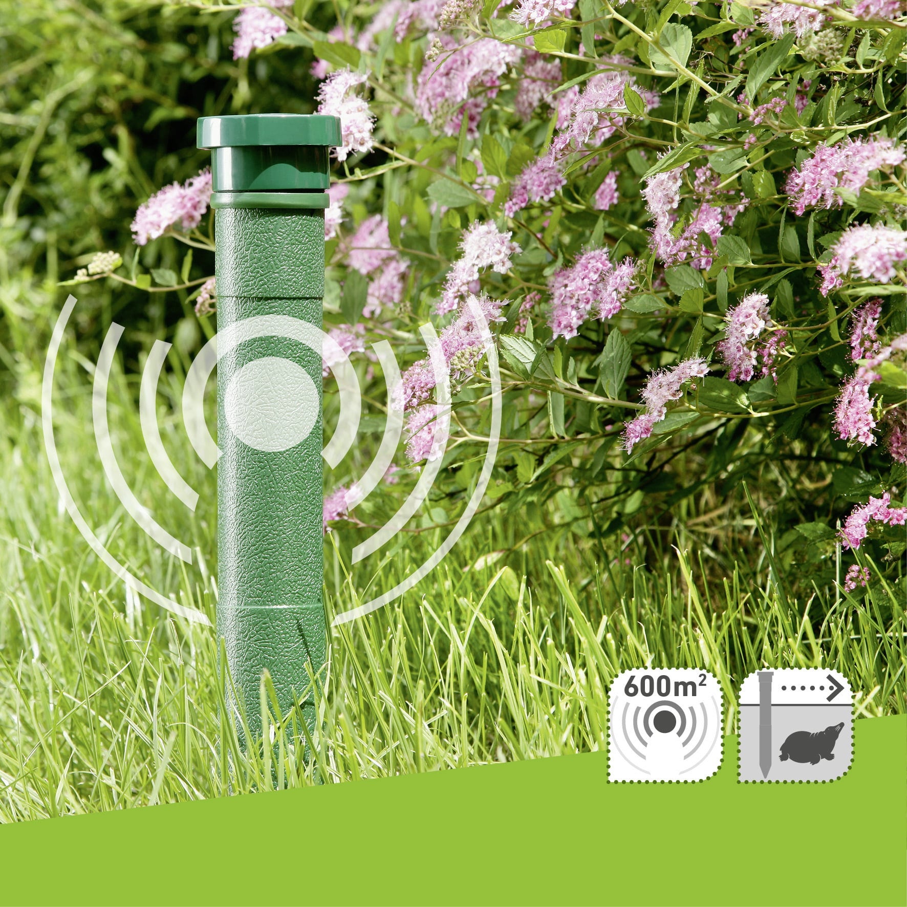 Utan att använda kemikalier kan du med denna sork- och mullvadsskrämma effektivt hålla skadedjur borta. Den cirkulära utsändningen av lågfrekventa ljudvågor uppfattas knappt av människor, men får möss och mullvadar att snabbt lämna området.