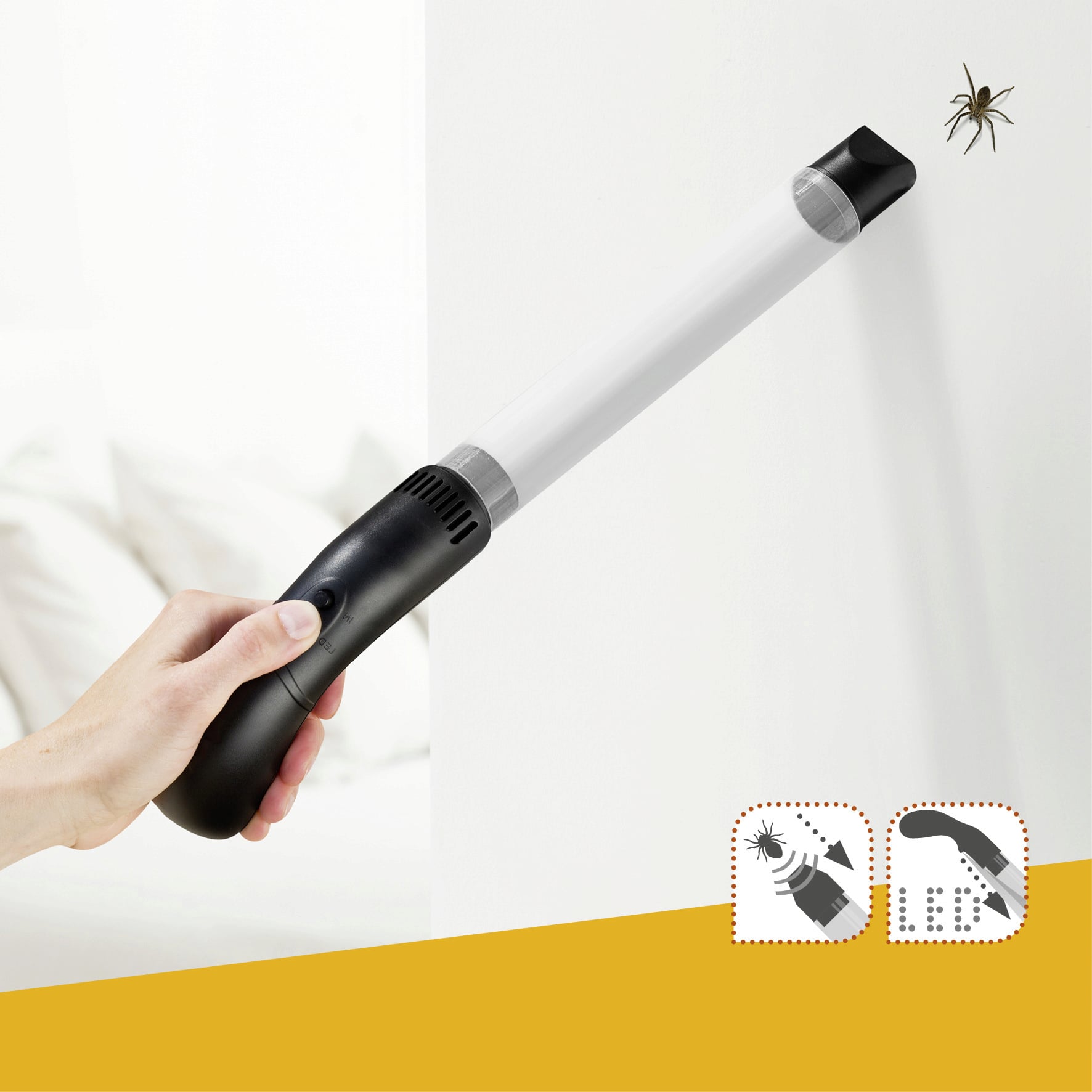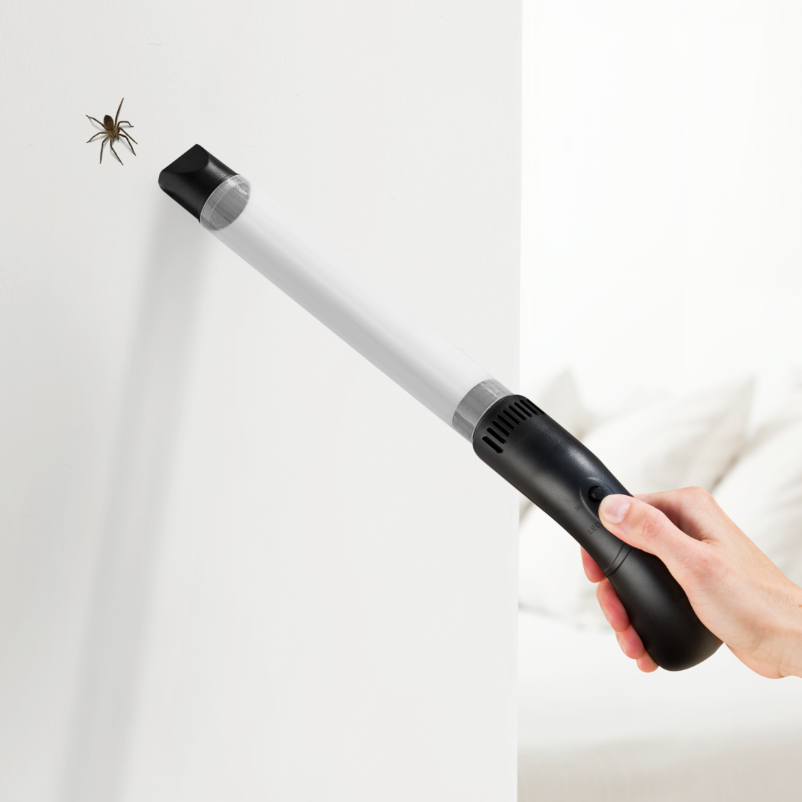 Denna innovativa spindel- och insektsfångare är ett djurvänligt sätt att snabbt och säkert få bort oönskade kryp från hemmet. Insekterna skadas inte utan sugs bara in, så att du enkelt kan släppa ut dem i det fria igen. Extra smart: den inbyggda LED-lampan gör det lätt att fånga insekter även i mörka hörn.
